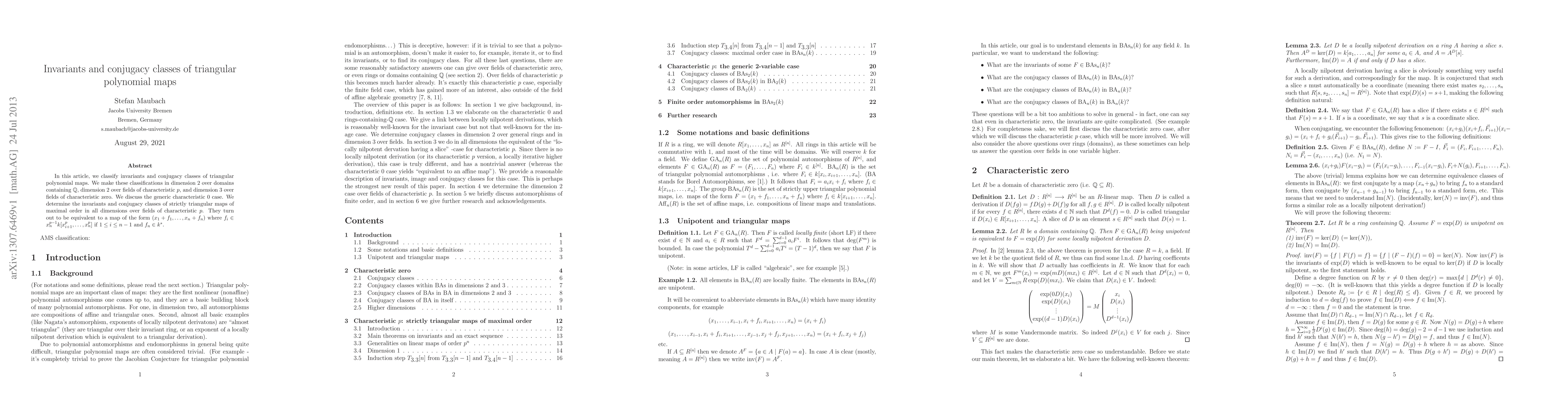 This paper classifies invariants and conjugacy classes of triangular polynomial maps in dimensions 2 and 3 across various characteristics, focusing on strictly triangular maps of maximal order, which are shown to be equivalent to maps of the form $(x_1+f_1,\ldots,x_n+f_n)$ with specific polynomial forms for $f_i$.