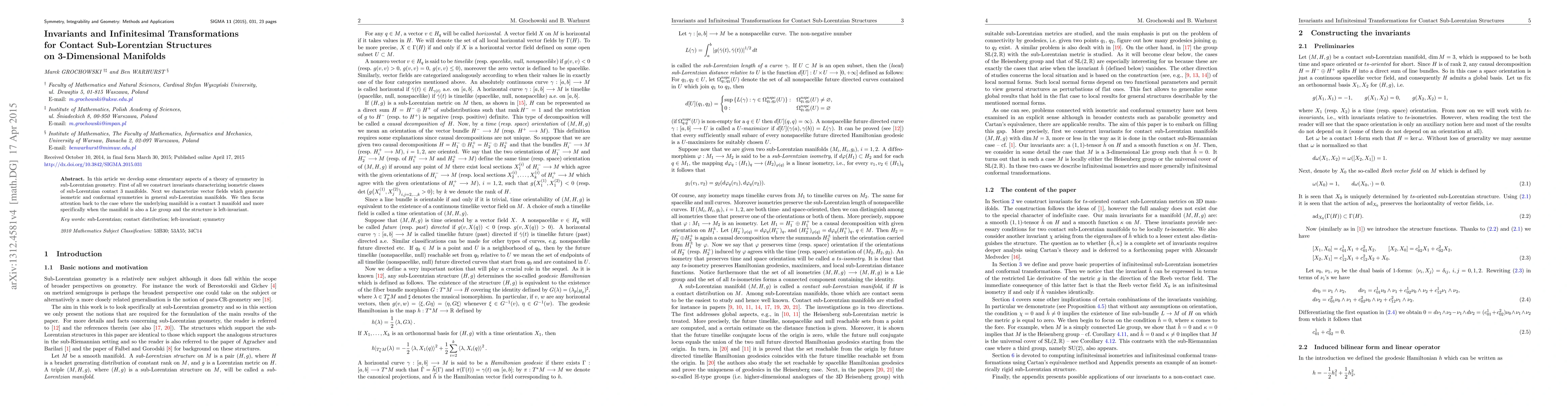 In this article we develop some elementary aspects of a theory of symmetry in sub-Lorentzian geometry. First of all we construct invariants characterizing isometric classes of sub-Lorentzian contact 3 manifolds. Next we characterize vector fields which generate isometric and conformal symmetries in general sub-Lorentzian manifolds. We then focus attention back to the case where the underlying manifold is a contact 3 manifold and more specifically when the manifold is also a Lie group and the structure is left-invariant.