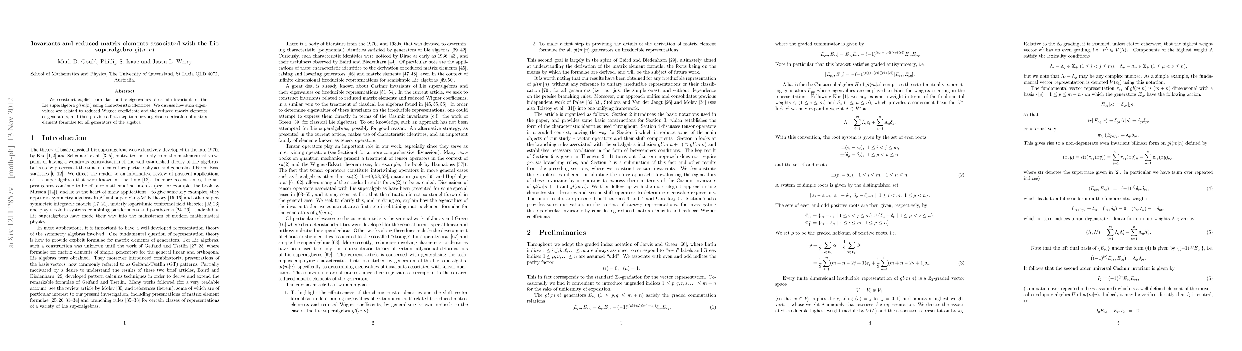 The paper provides explicit formulae for eigenvalues of invariants in the Lie superalgebra gl(m|n) via characteristic identities, linking these eigenvalues to reduced Wigner coefficients and matrix elements of generators, paving the way for a new algebraic method to derive matrix element formulae.