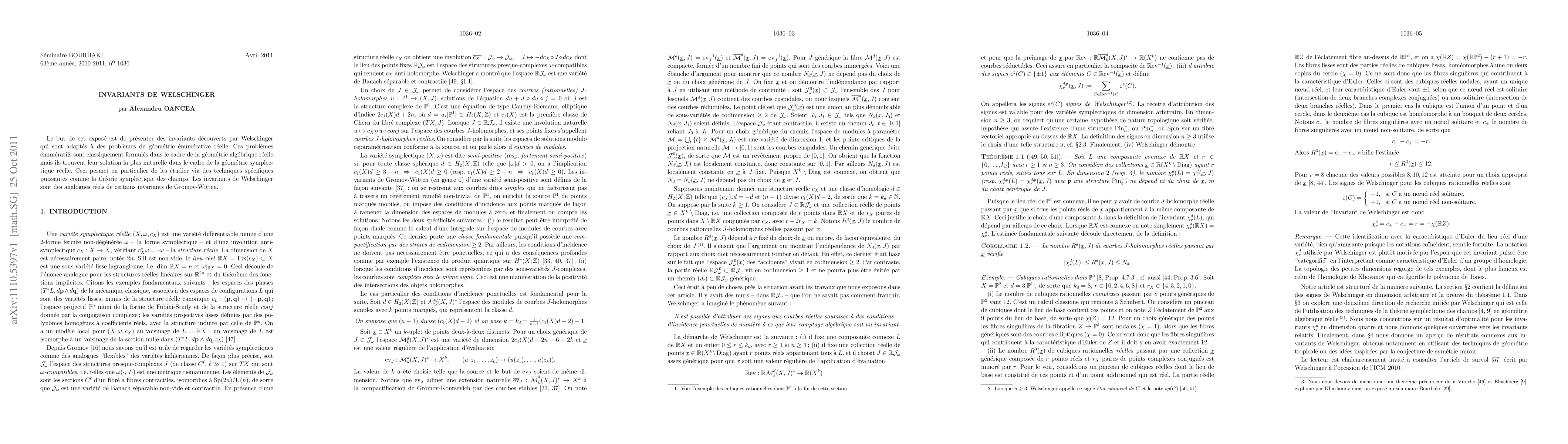 Summary: This paper provides an overview of Welschinger invariants, real analogues of Gromov-Witten invariants, discovered in the context of enumerative real algebraic geometry, with a focus on their definition and study within real symplectic geometry using techniques from symplectic field theory. It serves as extended notes for a Bourbaki seminar talk from April 2011.