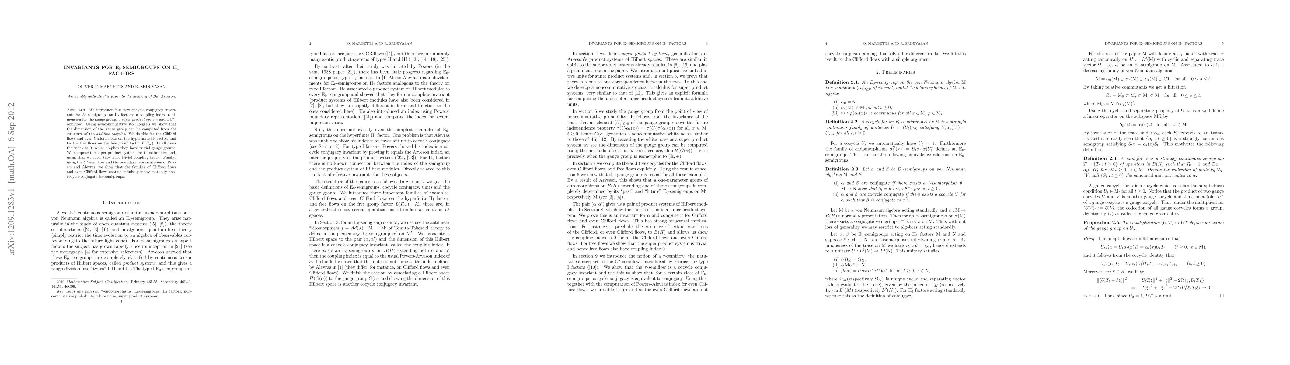 We introduce four new cocycle conjugacy invariants for E_0-semigroups on II_1 factors: a coupling index, a dimension for the gauge group, a super product system and a C*-semiflow. Using noncommutative It\^o integrals we show that the dimension of the gauge group can be computed from the structure of the additive cocycles. We do this for the Clifford flows and even Clifford flows on the hyperfinite II_1 factor, and for the free flows on the free group factor $L(F_\infty)$. In all cases the index is 0, which implies they have trivial gauge groups. We compute the super product systems for these families and, using this, we show they have trivial coupling index. Finally, using the C*-semiflow and the boundary representation of Powers and Alevras, we show that the families of Clifford flows and even Clifford flows contain infinitely many mutually non-cocycle-conjugate E_0-semigroups.