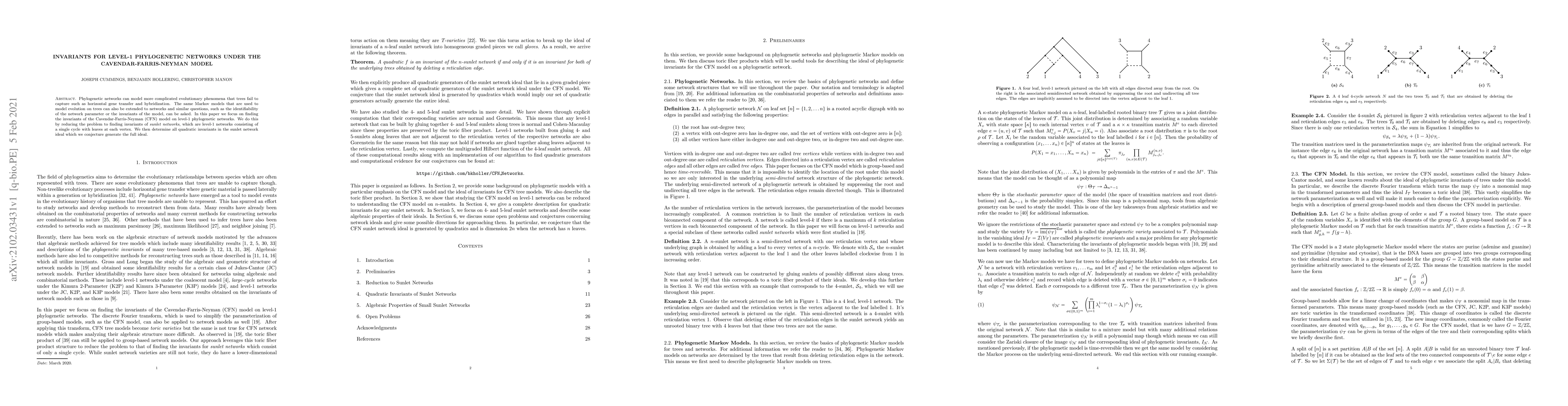 This research paper finds invariants for level-1 phylogenetic networks under the Cavendar-Farris-Neyman Model, a model that extends tree-based evolution to account for horizontal gene transfer and hybridization. The study identifies quadratic invariants in sunlet networks, which are key to understanding the network parameter.