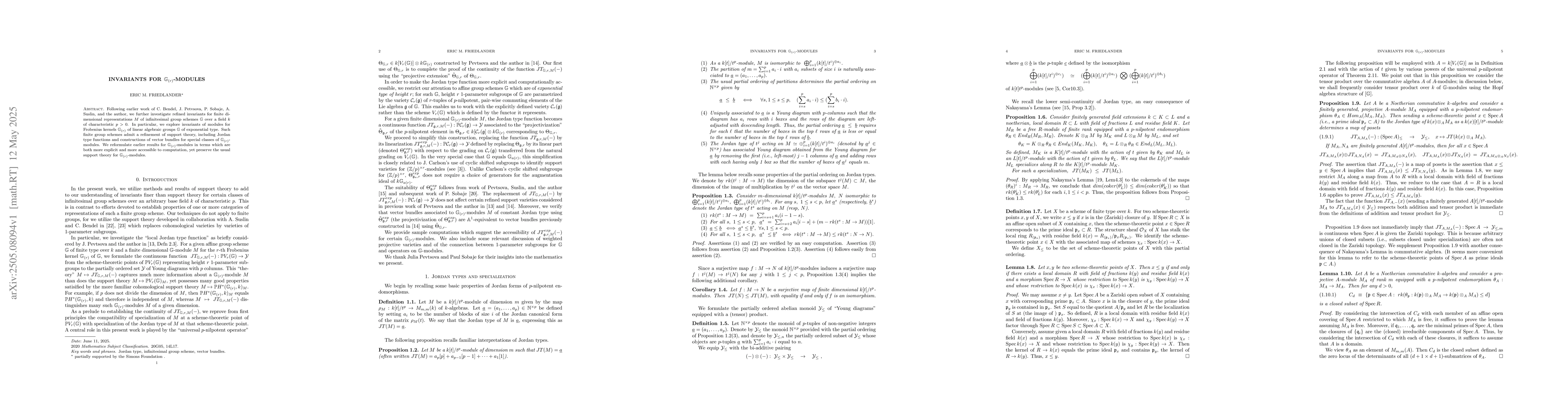 The research builds upon earlier work by C. Bendel, J. Petvsova, P. Sobaje, A. Suslin, and the author, focusing on refined invariants for finite dimensional representations M of infinitesimal group schemes G over a field k of characteristic p>0. It specifically explores invariants of modules for Frobenius kernels G_(r) of linear algebraic groups G of exponential type, reformulating previous results for G_(r)-modules in more explicit and computationally accessible terms while preserving usual support theory.