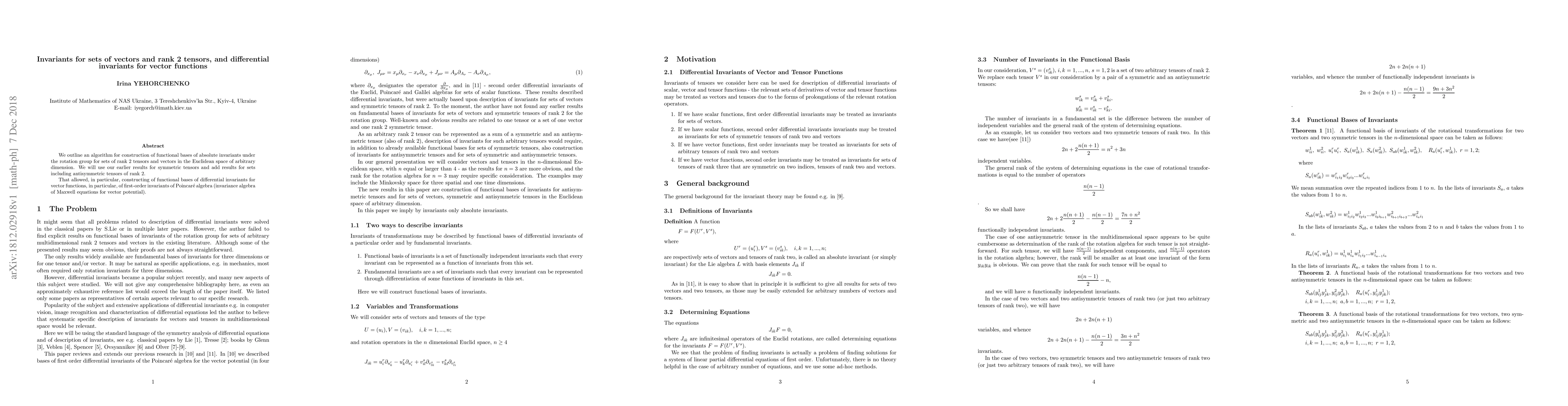 We outline an algorithm for construction of functional bases of absolute invariants under the rotation group for sets of rank 2 tensors and vectors in the Euclidean space of arbitrary dimension. We will use our earlier results for symmetric tensors and add results for sets including antisymmetric tensors of rank 2. That allowed, in particular, constructing of functional bases of differential invariants for vector functions, in particular, of first-order invariants of Poincar\'e algebra (invariance algebra of Maxwell equations for vector potential).