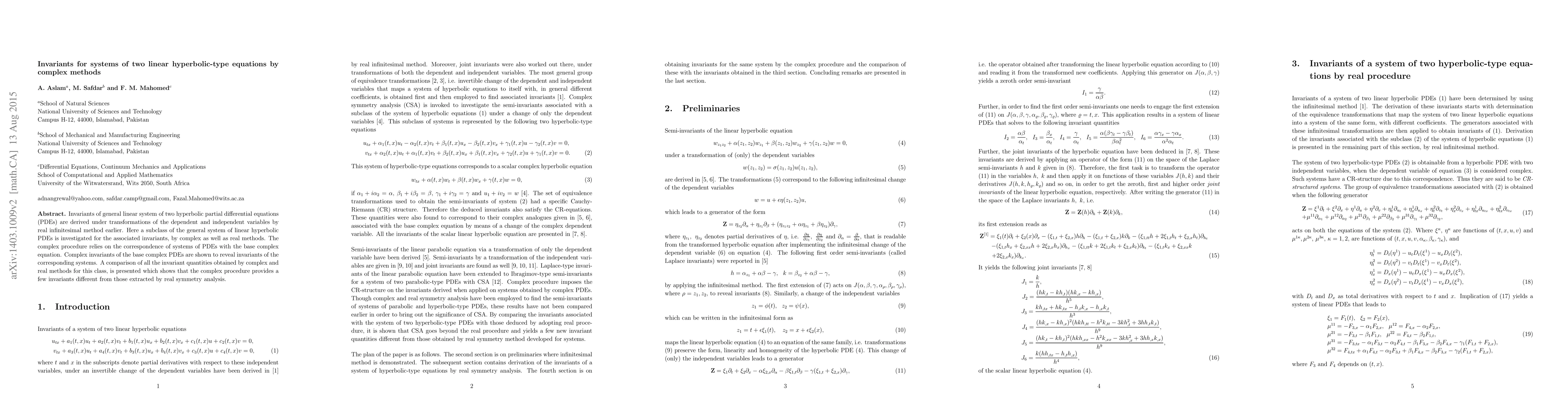 Invariants of general linear system of two hyperbolic partial differential equations (PDEs) are derived under transformations of the dependent and independent variables by real infinitesimal method earlier. Here a subclass of the general system of linear hyperbolic PDEs is investigated for the associated invariants, by complex as well as real methods. The complex procedure relies on the correspondence of systems of PDEs with the base complex equation. Complex invariants of the base complex PDEs are shown to reveal invariants of the corresponding systems. A comparison of all the invariant quantities obtained by complex and real methods for this class, is presented which shows that the complex procedure provides a few invariants different from those extracted by real symmetry analysis.