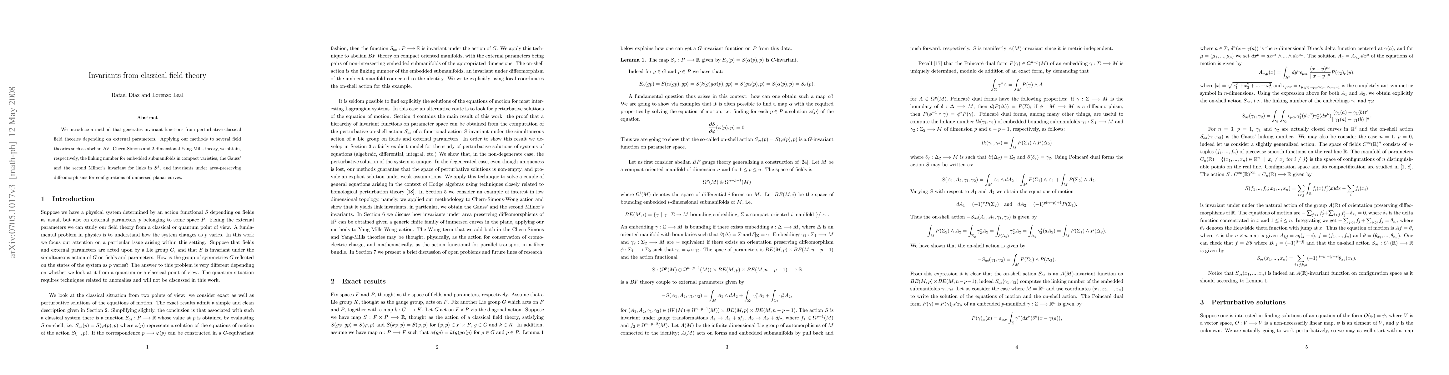 We introduce a method that generates invariant functions from perturbative classical field theories depending on external parameters. Applying our methods to several field theories such as abelian BF, Chern-Simons and 2-dimensional Yang-Mills theory, we obtain, respectively, the linking number for embedded submanifolds in compact varieties, the Gauss' and the second Milnor's invariant for links in S^3, and invariants under area-preserving diffeomorphisms for configurations of immersed planar curves.