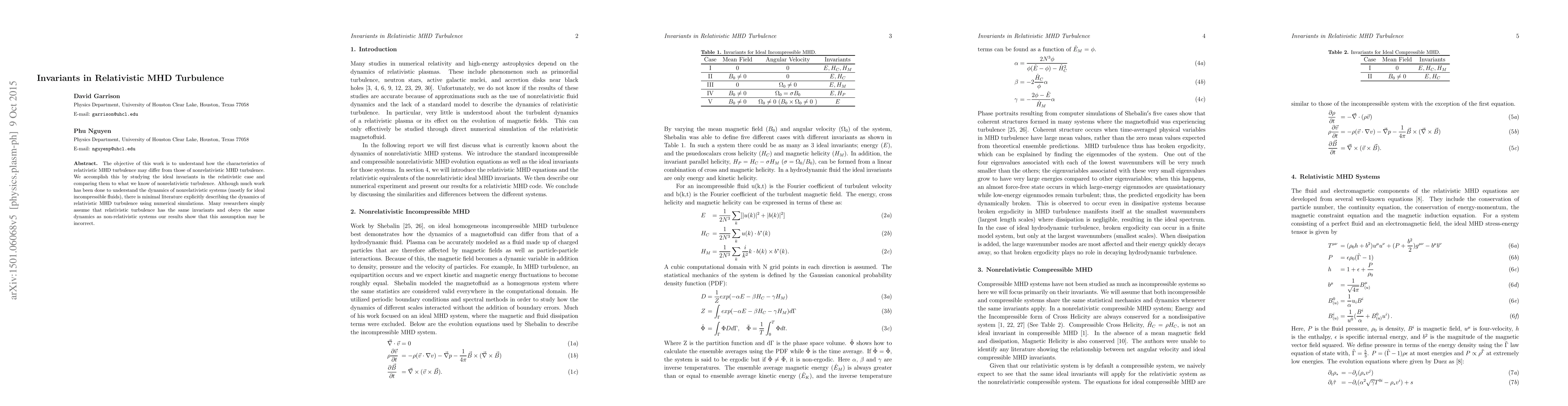 The objective of this work is to understand how the characteristics of relativistic MHD turbulence may differ from those of nonrelativistic MHD turbulence. We accomplish this by studying the ideal invariants in the relativistic case and comparing them to what we know of nonrelativistic turbulence. Although much work has been done to understand the dynamics of nonrelativistic systems (mostly for ideal incompressible fluids), there is minimal literature explicitly describing the dynamics of relativistic MHD turbulence using numerical simulations. Many researchers simply assume that relativistic turbulence has the same invariants and obeys the same dynamics as non-relativistic systems our results show that this assumption may be incorrect.