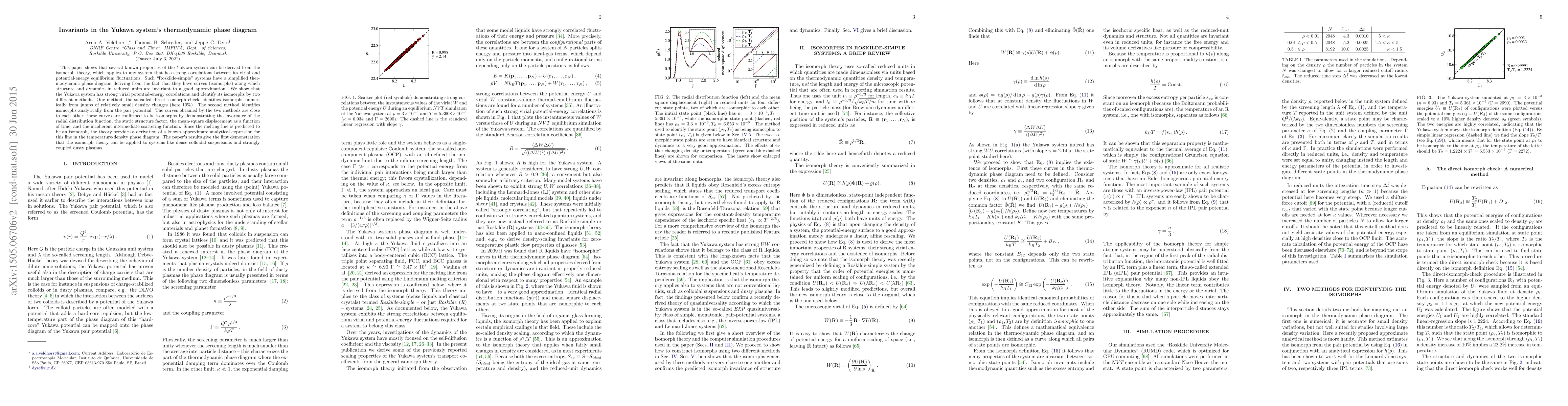 This paper shows that several known properties of the Yukawa system can be derived from the isomorph theory, which applies to any system that has strong correlations between its virial and potential-energy equilibrium fluctuations. Such "Roskilde-simple" systems have a simplified thermodynamic phase diagram deriving from the fact that they have curves (isomorphs) along which structure and dynamics in reduced units are invariant to a good approximation. We show that the Yukawa system has strong virial potential-energy correlations and identify its isomorphs by two different methods. One method, the so-called direct isomorph check, identifies isomorphs numerically from jumps of relatively small density changes (here 10%). The second method identifies isomorphs analytically from the pair potential. The curves obtained by the two methods are close to each other; these curves are confirmed to be isomorphs by demonstrating the invariance of the radial distribution function, the static structure factor, the mean-square displacement as a function of time, and the incoherent intermediate scattering function. Since the melting line is predicted to be an isomorph, the theory provides a derivation of a known approximate analytical expression for this line in the temperature-density phase diagram. The paper's results give the first demonstration that the isomorph theory can be applied to systems like dense colloidal suspensions and strongly coupled dusty plasmas.
