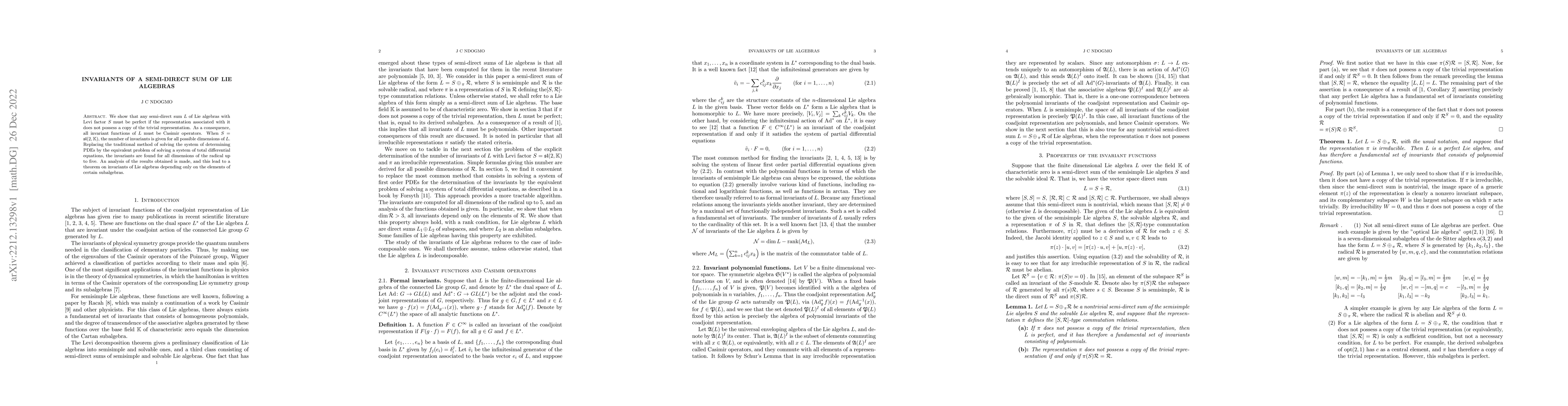 Summary: The paper proves that a semi-direct sum of Lie algebras is perfect if it lacks a trivial representation, leading to all invariant functions being Casimir operators. It also provides a new method to determine invariants by solving total differential equations, yielding results for dimensions up to five, and establishes a theorem about invariants based on specific subalgebras.