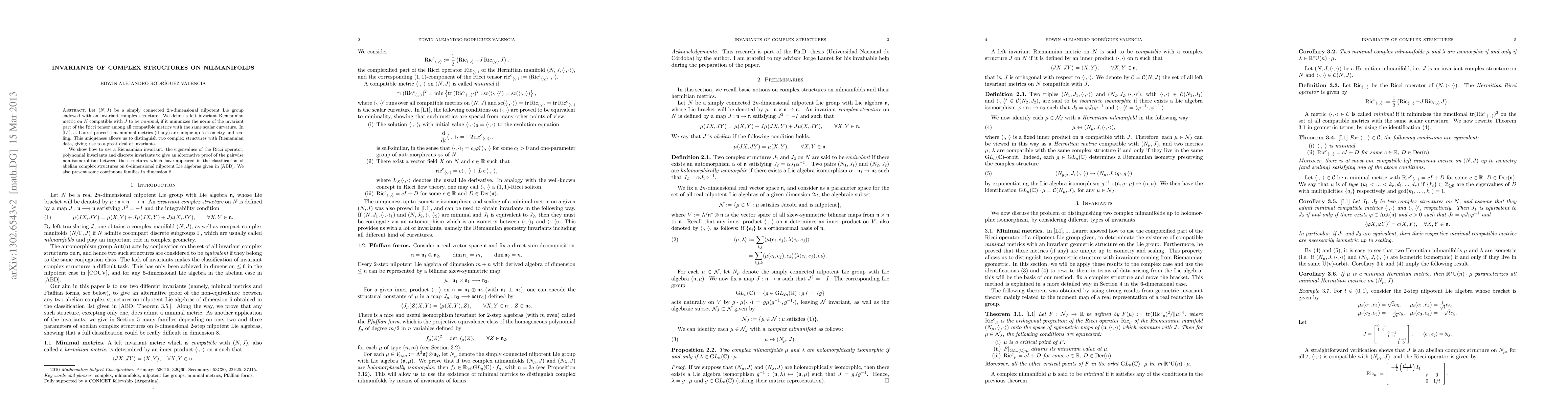 The paper analyzes complex structures on nilpotent Lie groups, defining minimal metrics compatible with invariant complex structures and proving their uniqueness up to isometry and scaling. It uses Riemannian invariants like eigenvalues of the Ricci operator and polynomial invariants to distinguish complex structures.