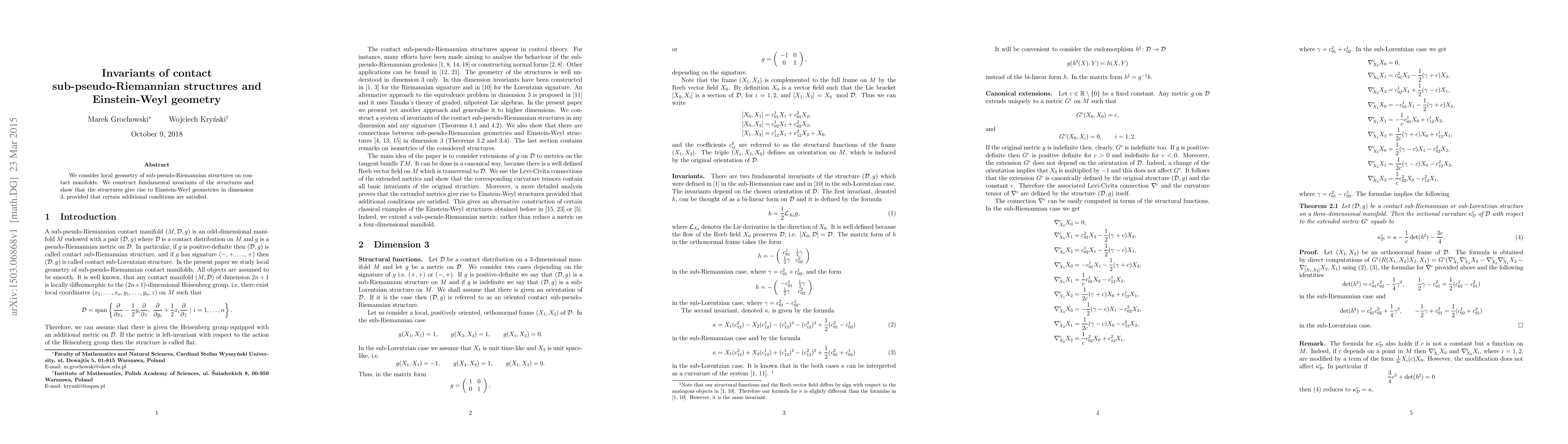 This paper investigates the local geometry of sub-pseudo-Riemannian structures on contact manifolds, constructing fundamental invariants and demonstrating that these structures yield Einstein-Weyl geometries in dimension 3 under specific conditions.