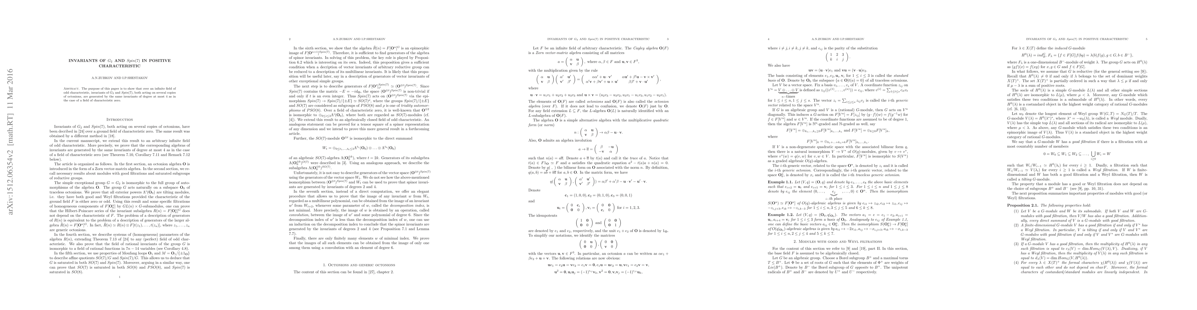 Invariants of $G_2$ and $Spin(7)$, both acting on several copies of octonions, have been decribed in \cite{schw2} over a ground field of characteristic zero. In the current manuscript, we extend this result to an arbitrary infinite field of odd characteristic. More precisely, we prove that the corresponding algebras of invariants are generated by the same invariants of degree at most $4$ as in the case of a field of characteristic zero.