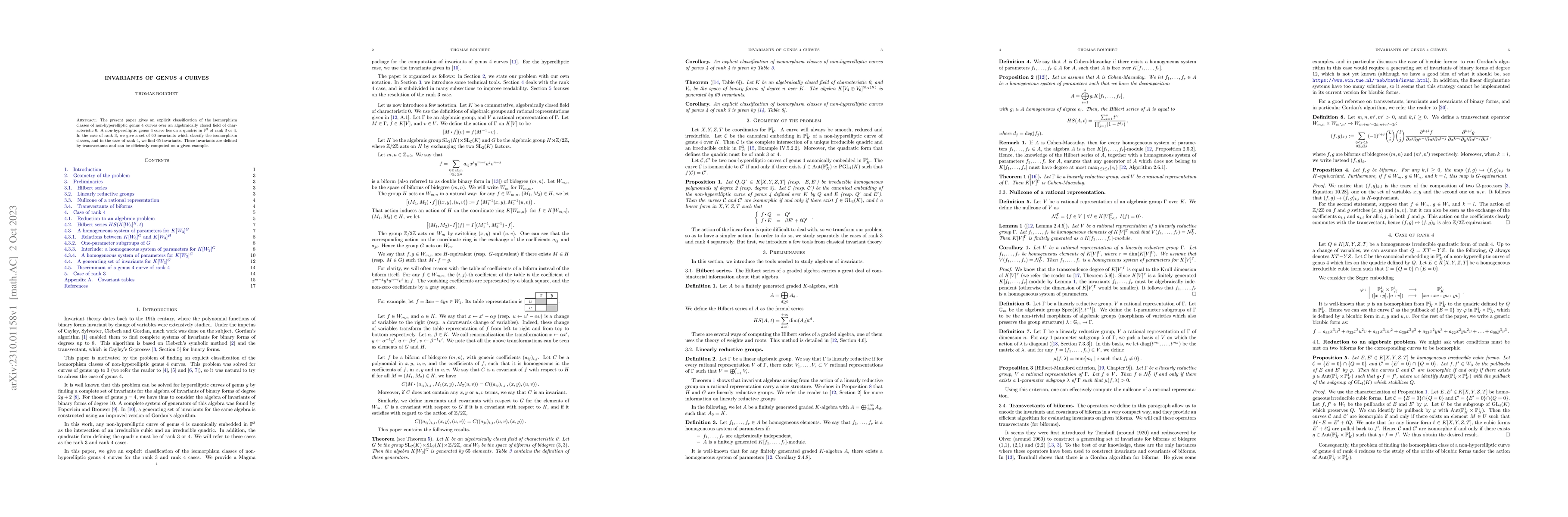 This paper classifies non-hyperelliptic genus 4 curves over a characteristic 0 field, providing 60 invariants for rank 3 quadric cases and 65 for rank 4, all derived from transvectants for efficient computation.