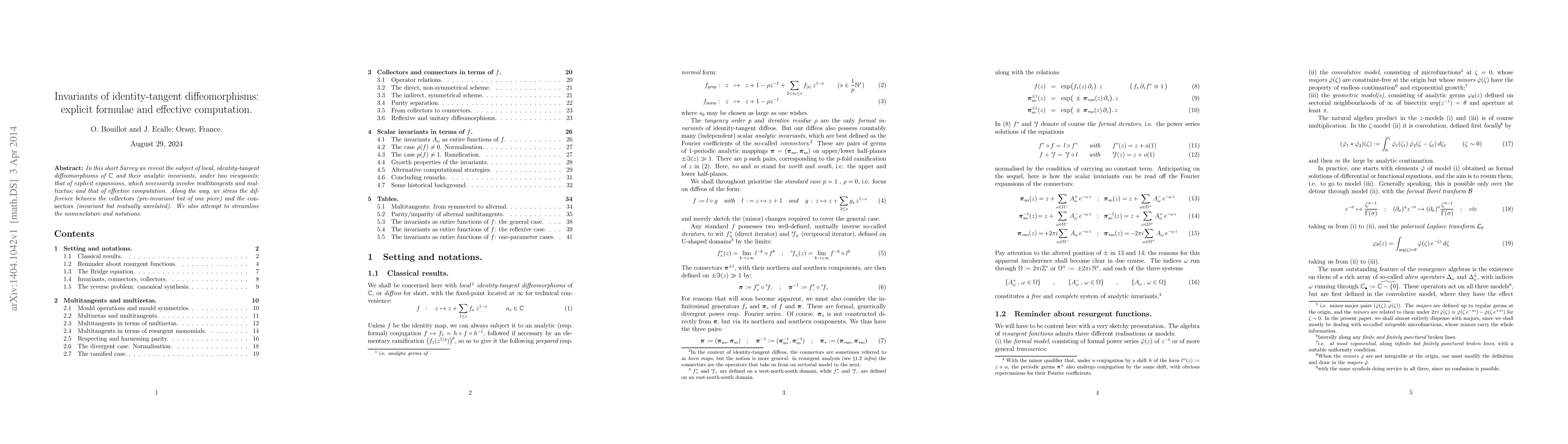 In this short Survey we revisit the subject of local, identity-tangent diffeomorphisms of $\doC$ and their analytic invariants, under two viewpoints: that of explicit expansions, which necessarily involve multitangents and multizetas; and that of effective computation. Along the way, we stress the difference between the \textup{collectors} (pre-invariant but of one piece) and the \textup{connectors} (invariant but mutually unrelated). We also attempt to streamline the nomenclature and notations.