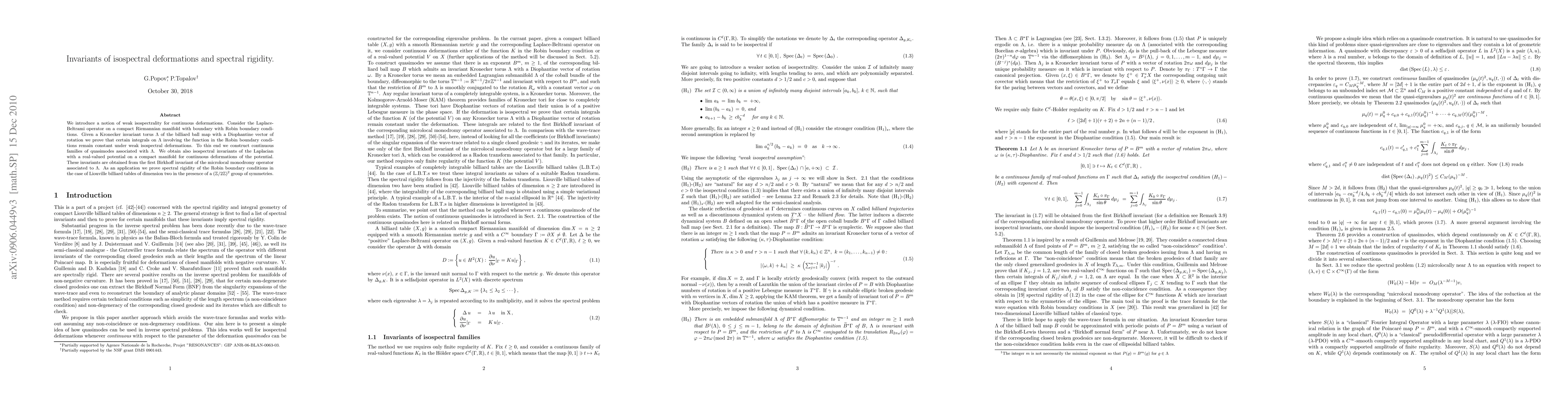 We introduce a notion of weak isospectrality for continuous deformations. Consider the Laplace-Beltrami operator on a compact Riemannian manifold with boundary with Robin boundary conditions. Given a Kronecker invariant torus $\Lambda$ of the billiard ball map with a vector of rotation satisfying a Diophantine condition we prove that certain integrals on $\Lambda$ involving the function in the Robin boundary conditions remain constant under weak isospectral deformations. To this end we construct continuous families of quasimodes associated with $\Lambda$. We obtain also isospectral invariants of the Laplacian with a real-valued potential on a compact manifold for continuous deformations of the potential. As an application we prove spectral rigidity in the case of Liouville billiard tables of dimension two.