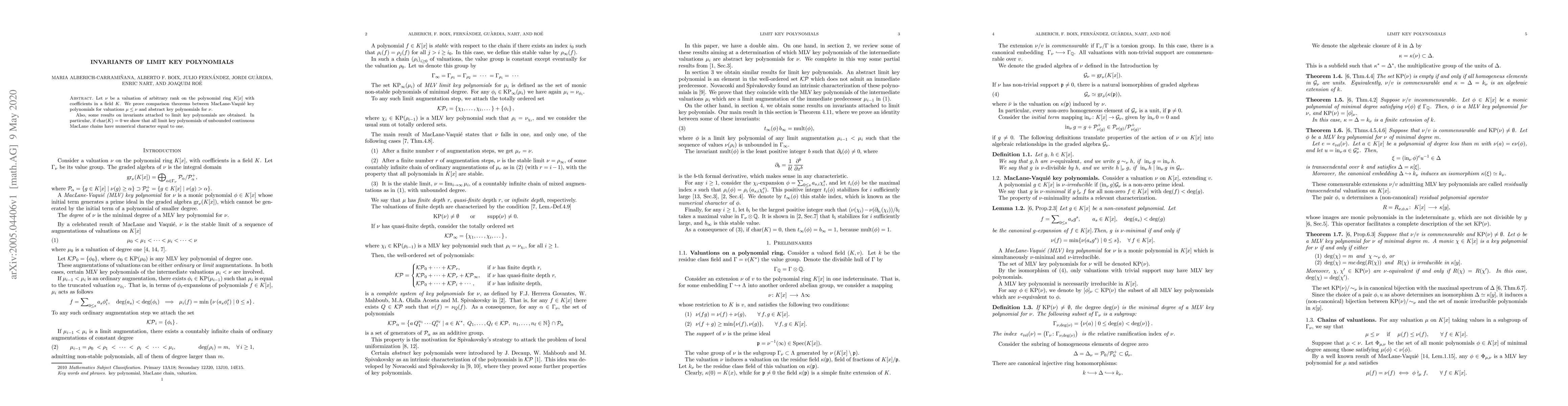 This paper proves comparison theorems between MacLane-Vaquié key polynomials for nested valuations and abstract key polynomials for a given valuation in a polynomial ring over a field. It also establishes invariants for limit key polynomials, showing that in characteristic zero, all limit key polynomials of unbounded continuous MacLane chains have a numerical character of one.