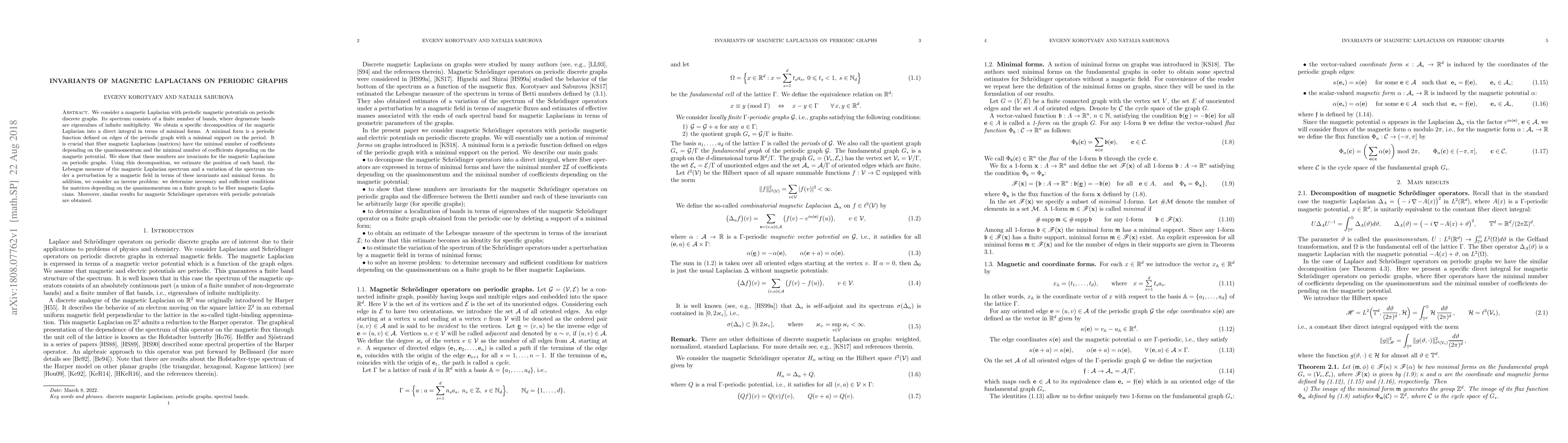 This paper decomposes the magnetic Laplacian on periodic graphs into a direct integral using minimal forms, revealing invariants tied to quasimomentum and magnetic potentials. It also estimates band positions and spectrum variations based on these invariants.