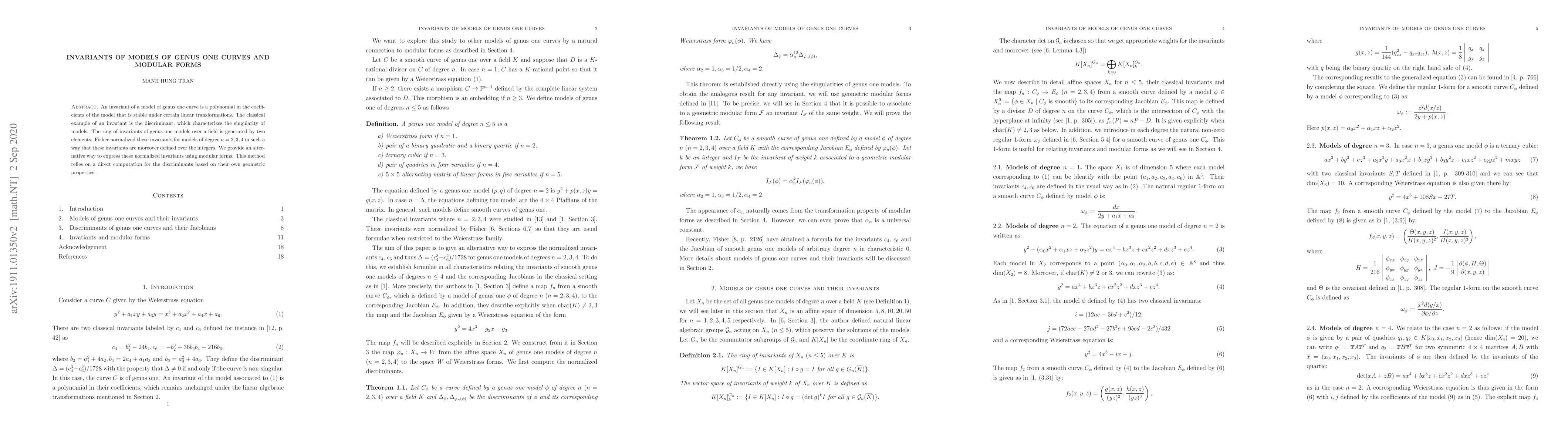 The paper explores invariants of genus one curve models, revealing that their ring of invariants is generated by two elements. An alternative expression of Fisher's normalized invariants is presented using modular forms, leveraging geometric properties for discriminant computations.