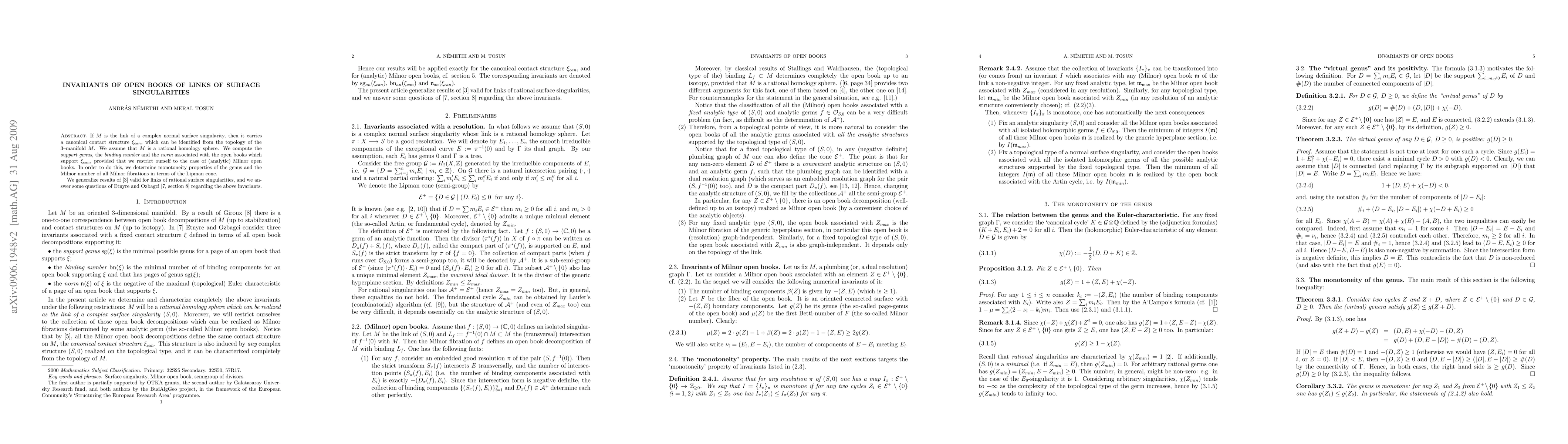 In the present article we determine and characterize completely the support genus, the binding number and the norm of a page of an open book under the following restrictions: M is a rational homology sphere which can be realized as the link of a surface singularity. Moreover, we restrict ourselves to the collection of those open book decompositions which can be realized as Milnor fibrations determined by some analytic germ (the so-called Milnor open books).