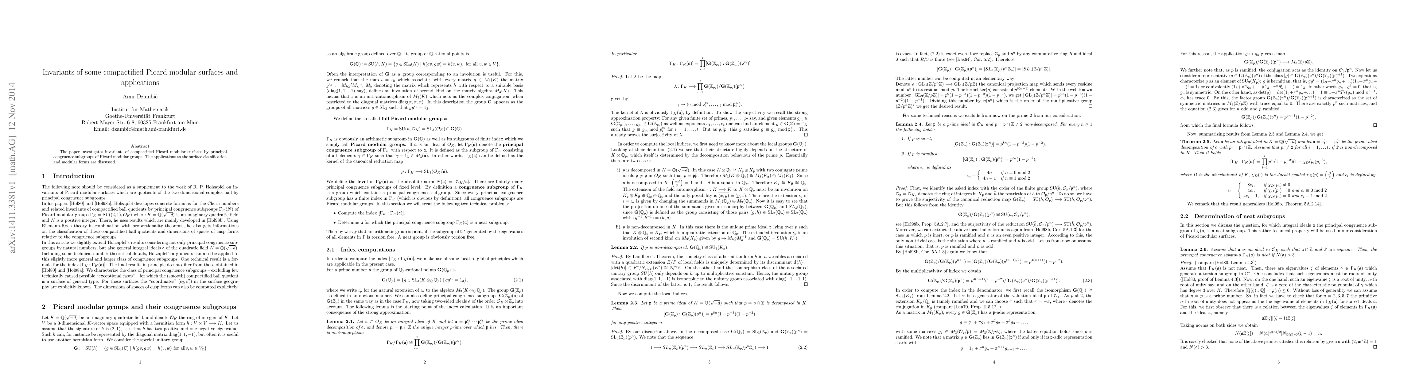 The paper explores invariants associated with compactified Picard modular surfaces, focusing on their classification via principal congruence subgroups. It also examines applications to surface categorization and modular forms.