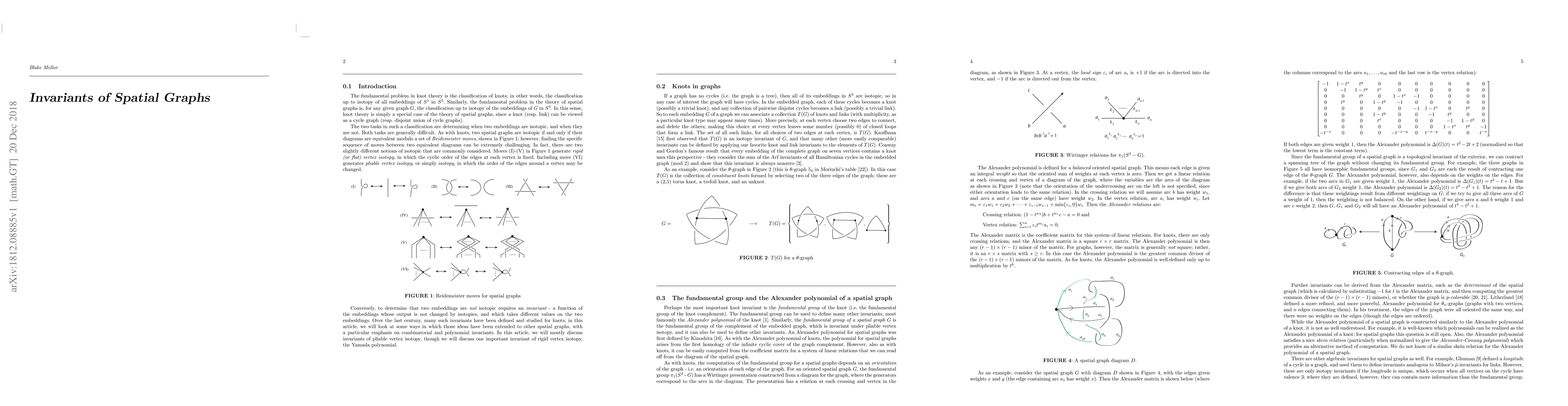 Summary: This article reviews combinatorial and polynomial invariants of spatial graphs, focusing on the Alexander polynomial, fundamental quandle, and Yamada polynomial for their role in knot theory. The paper is part of "A Concise Encyclopedia of Knot Theory."