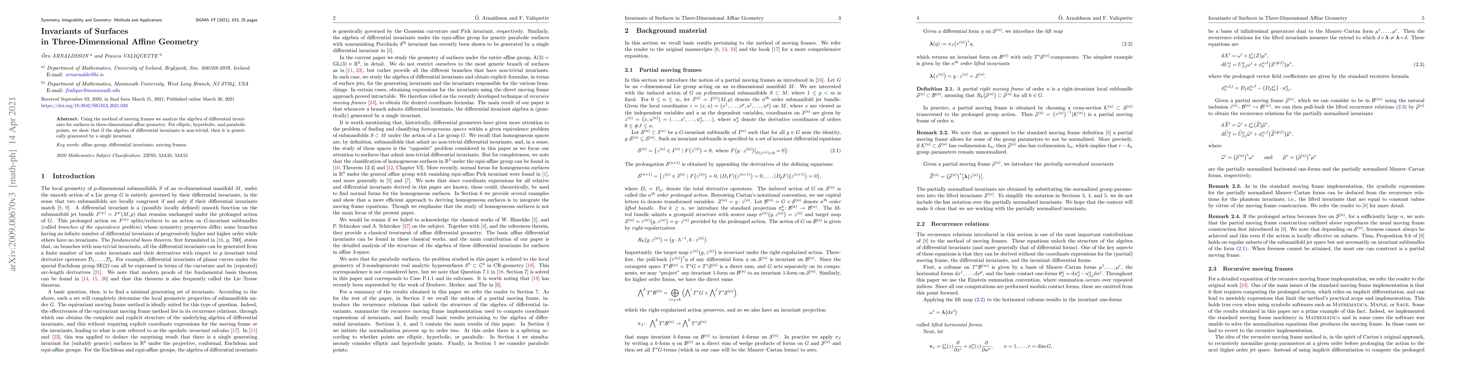 Summary: This paper employs moving frames to study differential invariants of surfaces in three-dimensional affine geometry, demonstrating that non-trivial invariant algebras are typically generated by a single invariant for elliptic, hyperbolic, and parabolic points.