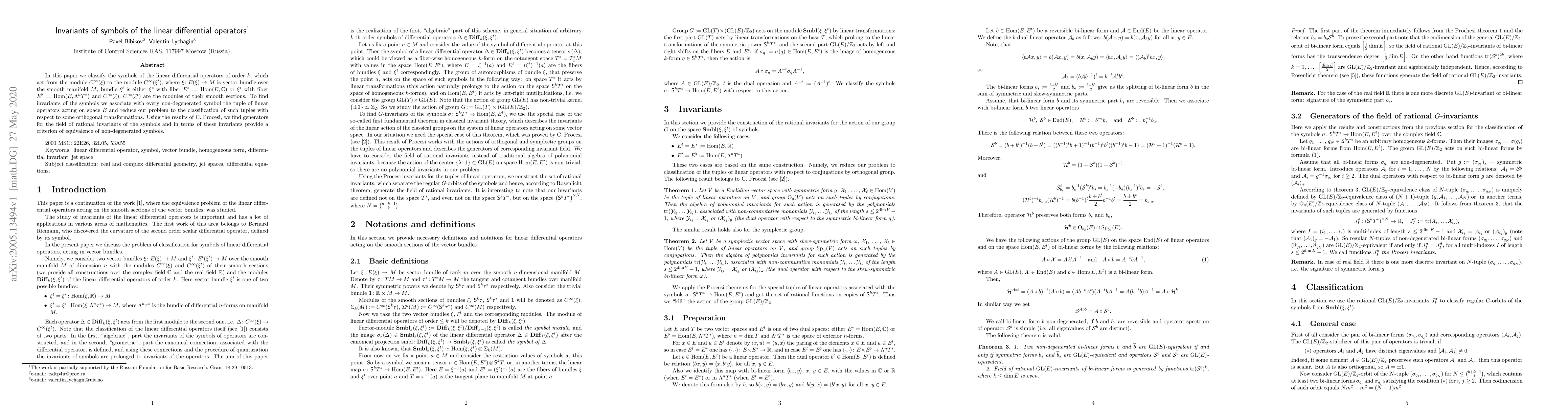 In this paper we classify the symbols of the linear differential operators of order $k$, which act from the module $C^\infty(\xi)$ to the module $C^\infty(\xi^t)$, where $\xi\colon E(\xi)\to M$ is vector bundle over the smooth manifold $M$, bundle $\xi^t$ is either $\xi^*$ with fiber $E^*:=\mathrm{Hom}(E,\mathbb{C})$ or $\xi^\flat$ with fiber $E^\flat:=\mathrm{Hom}(E, \Lambda^n T^*)$ and $C^\infty(\xi)$, $C^\infty(\xi^t)$ are the modules of their smooth sections. To find invariants of the symbols we associate with every non-degenerated symbol the tuple of linear operators acting on space $E$ and reduce our problem to the classification of such tuples with respect to some orthogonal transformations. Using the results of C. Procesi, we find generators for the field of rational invariants of the symbols and in terms of these invariants provide a criterion of equivalence of non-degenerated symbols.