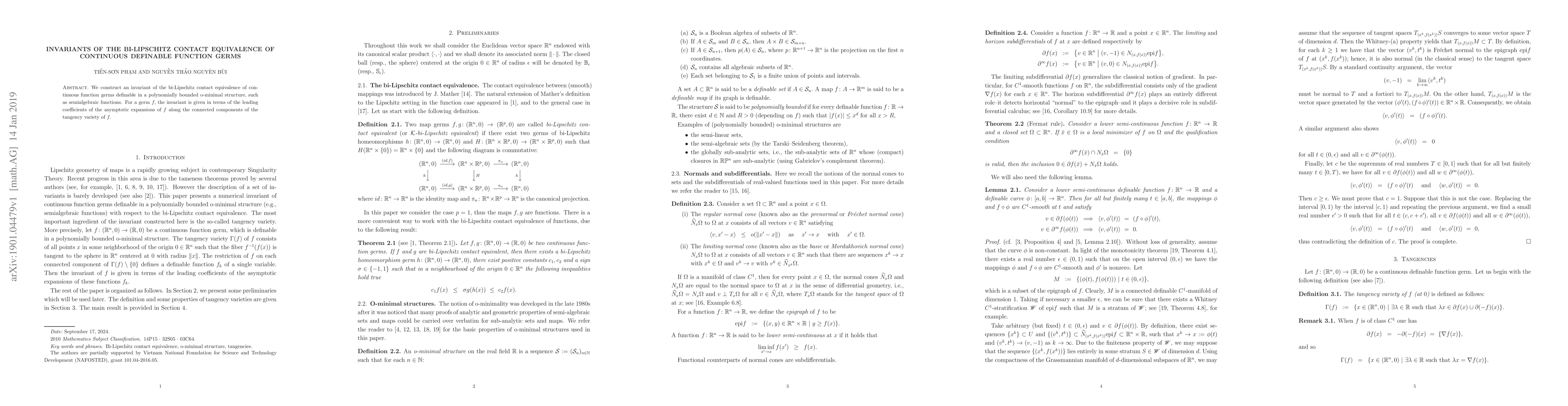 We construct an invariant of the bi-Lipschitz contact equivalence of continuous function germs definable in a polynomially bounded o-minimal structure, such as semialgebraic functions. For a germ $f,$ the invariant is given in terms of the leading coefficients of the asymptotic expansions of $f$ along the connected components of the tangency variety of $f.$