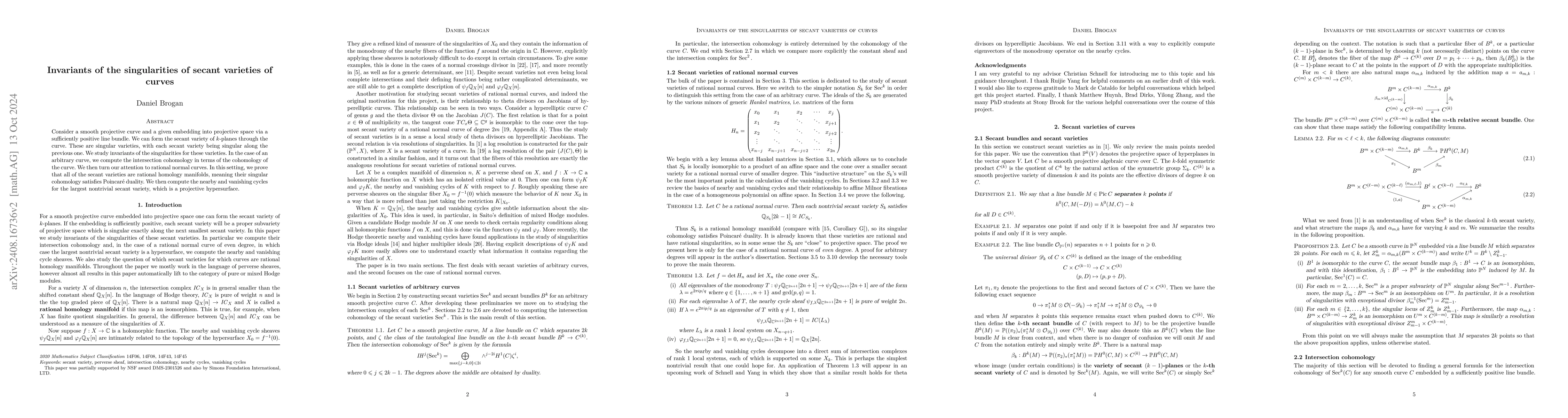 This paper studies invariants of singularities in secant varieties of smooth projective curves embedded in projective space, focusing on rational normal curves. It computes intersection cohomology in terms of the curve's cohomology and proves that all secant varieties of rational normal curves are rational homology manifolds, computing their nearby and vanishing cycles.
