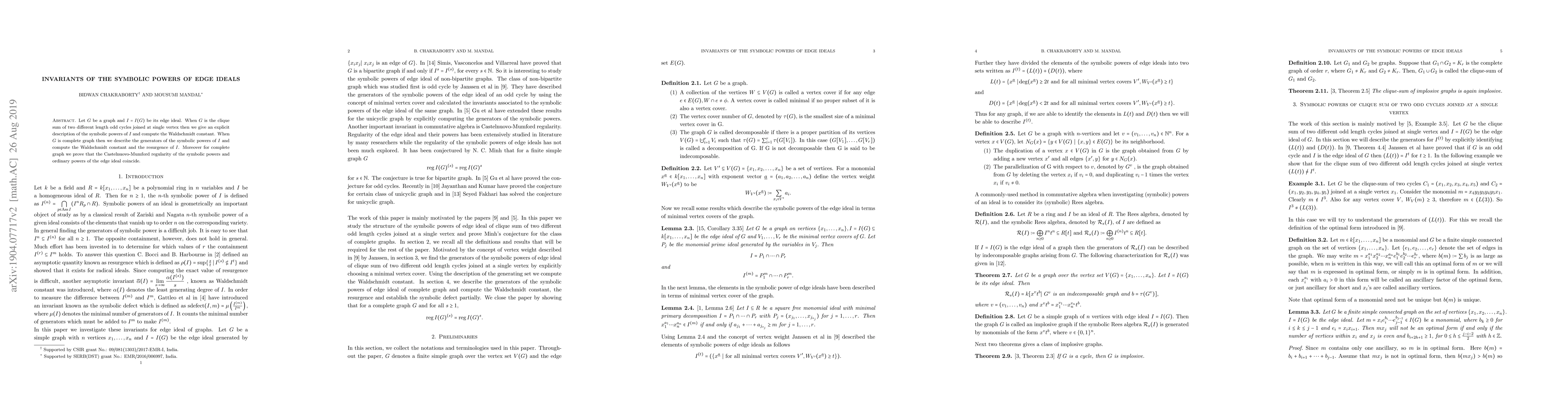 Let $G$ be a graph and $I=I(G)$ be its edge ideal. When $G$ is the clique sum of two different length odd cycles joined at single vertex then we give an explicit description of the symbolic powers of $I$ and compute the Waldschmidt constant. When $G$ is complete graph then we describe the generators of the symbolic powers of $I$ and compute the Waldschmidt constant and the resurgence of $I$. Moreover for complete graph we prove that the Castelnuvo-Mumford regularity of the symbolic powers and ordinary powers of the edge ideal coincide.