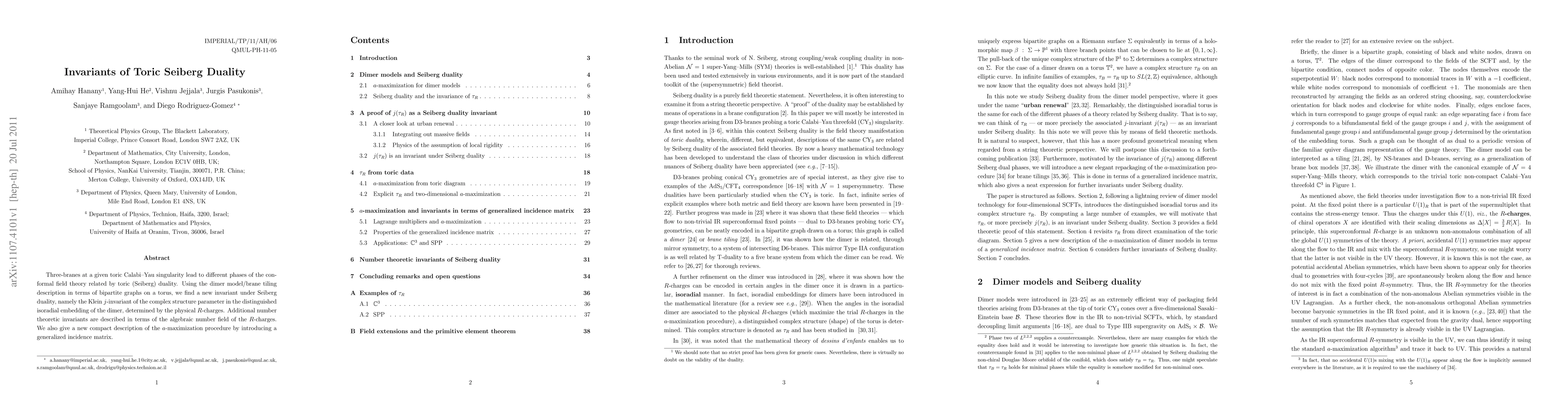 Three-branes at a given toric Calabi-Yau singularity lead to different phases of the conformal field theory related by toric (Seiberg) duality. Using the dimer model/brane tiling description in terms of bipartite graphs on a torus, we find a new invariant under Seiberg duality, namely the Klein j-invariant of the complex structure parameter in the distinguished isoradial embedding of the dimer, determined by the physical R-charges. Additional number theoretic invariants are described in terms of the algebraic number field of the R-charges. We also give a new compact description of the a-maximization procedure by introducing a generalized incidence matrix.