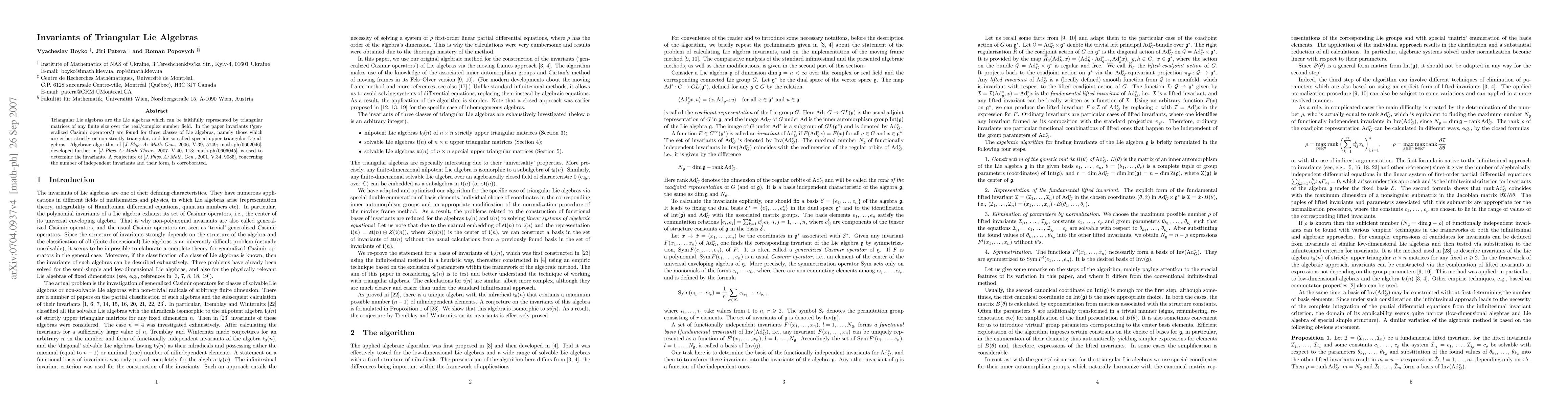 This paper identifies invariants for three types of triangular Lie algebras: strictly triangular, non-strictly triangular, and special upper triangular. The algebraic algorithm developed in previous works is utilized to determine these invariants, supporting a longstanding conjecture regarding their number and form.