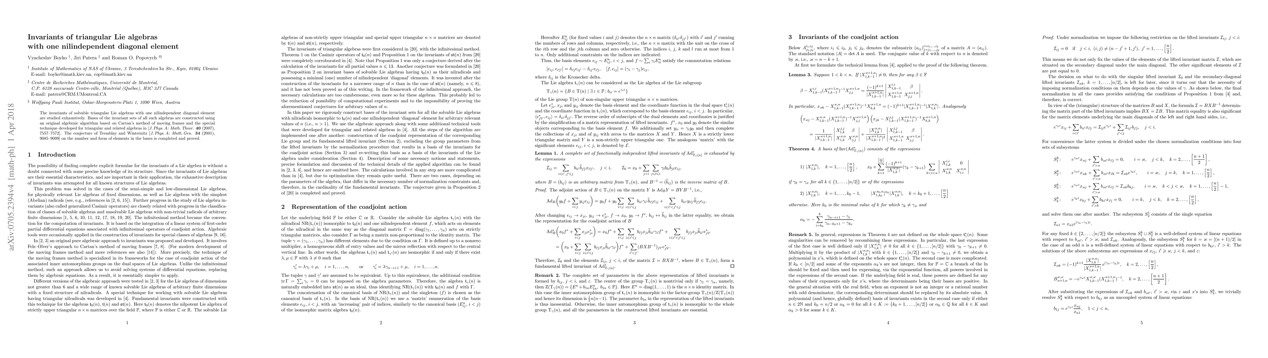 This paper constructs bases for the invariant sets of solvable triangular Lie algebras with one nilindependent diagonal element using a novel algorithm combining Cartan's method and a specialized technique. It confirms and completes the conjecture by Tremblay and Winternitz regarding the structure of these bases.