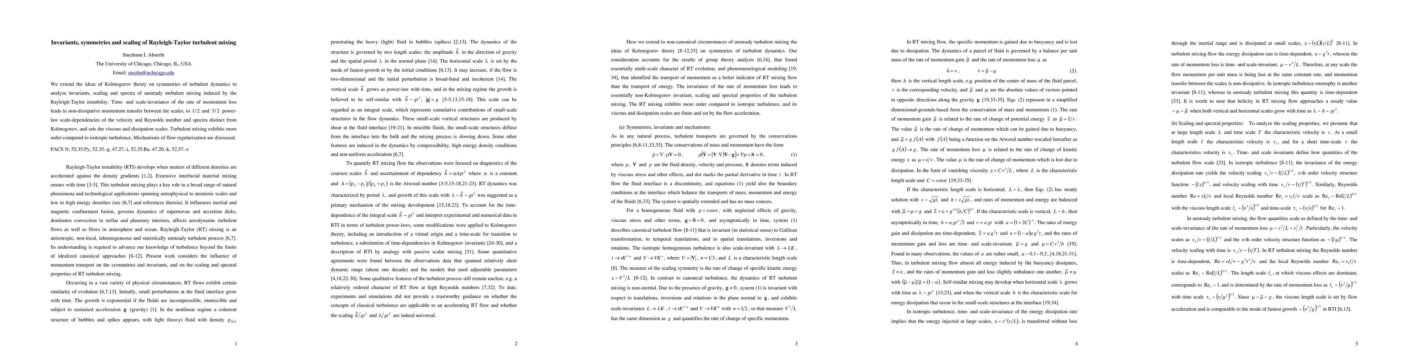 We extend the ideas of Kolmogorov theory on symmetries of turbulent dynamics to analyze invariants, scaling and spectra of unsteady turbulent mixing induced by the Rayleigh-Taylor instability. Time- and scale-invariance of the rate of momentum loss leads to non-dissipative momentum transfer between the scales, to and power-law scale-dependencies of the velocity and Reynolds number and spectra distinct from Kolmogorov, and sets the viscous and dissipation scales. Turbulent mixing exhibits more order compared to isotropic turbulence. Mechanisms of flow regularization are discussed.