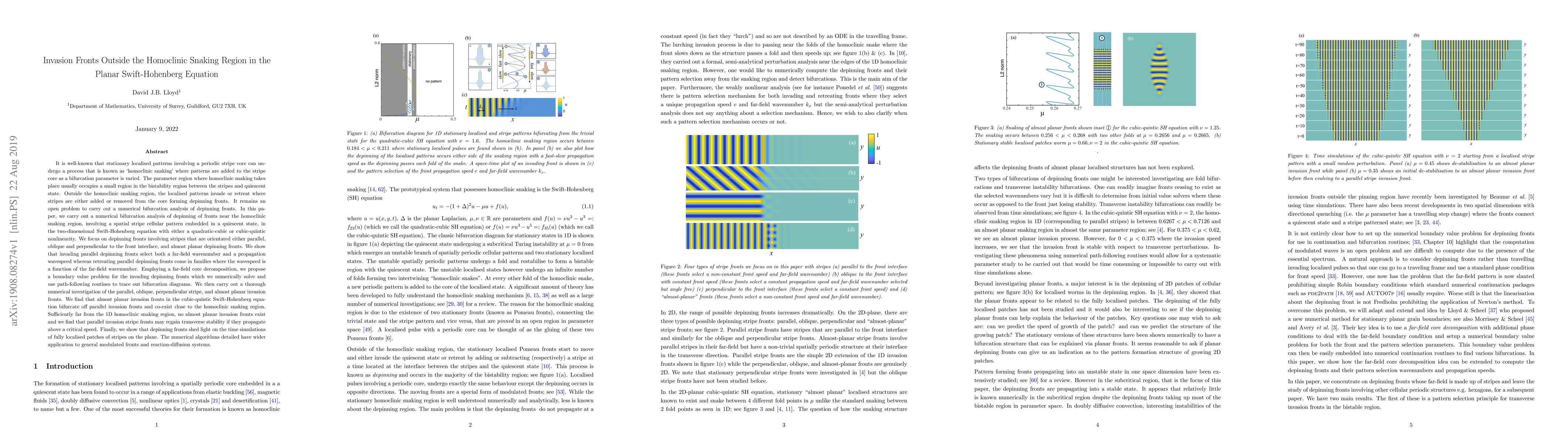 In this paper, we carry out numerical bifurcation analysis of depinning of fronts near the homoclinic snaking region, involving a spatial stripe cellular pattern embedded in a quiescent state, in the two-dimensional Swift-Hohenberg equation with either a quadratic-cubic or cubic-quintic nonlinearity. We focus on depinning fronts involving stripes that are orientated either parallel, oblique and perpendicular to the front interface, and almost planar depinning fronts. We show that invading parallel depinning fronts select both a far-field wavenumber and a propagation wavespeed whereas retreating parallel depinning fronts come in families where the wavespeed is a function of the far-field wavenumber. Employing a far-field core decomposition, we propose a boundary value problem for the invading depinning fronts which we numerically solve and use path-following routines to trace out bifurcation diagrams. We then carry out a thorough numerical investigation of the parallel, oblique, perpendicular stripe, and almost planar invasion fronts. We find that almost planar invasion fronts in the cubic-quintic Swift-Hohenberg equation bifurcate off parallel invasion fronts and co-exist close to the homoclinic snaking region. Sufficiently far from the 1D homoclinic snaking region, no almost planar invasion fronts exist and we find that parallel invasion stripe fronts may regain transverse stability if they propagate above a critical speed. Finally, we show that depinning fronts shed light on the time simulations of fully localised patches of stripes on the plane. The numerical algorithms detailed have wider application to general modulated fronts and reaction-diffusion systems.