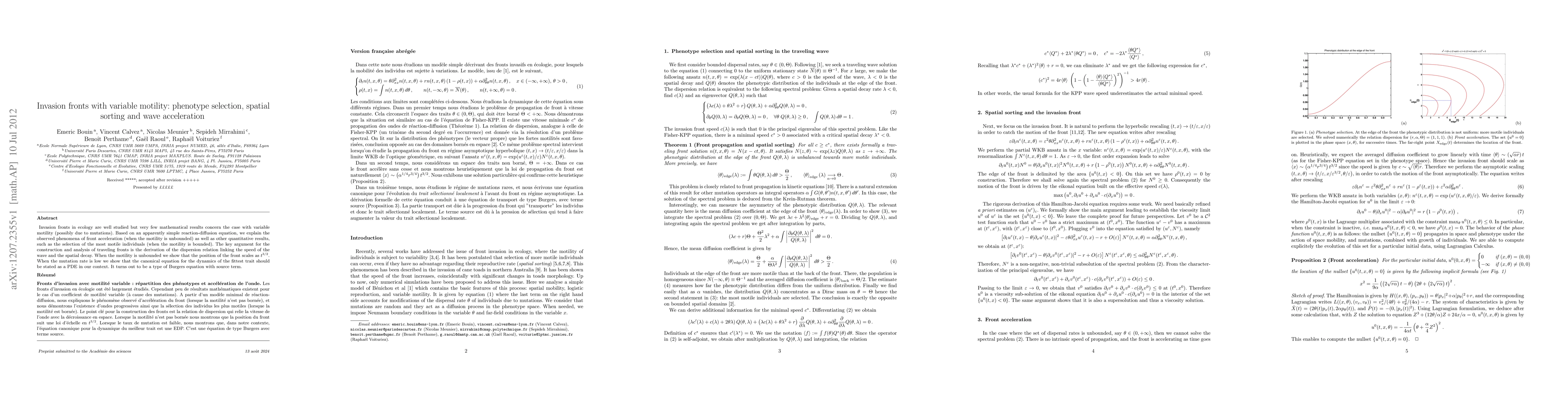 Invasion fronts in ecology are well studied but very few mathematical results concern the case with variable motility (possibly due to mutations). Based on an apparently simple reaction-diffusion equation, we explain the observed phenomena of front acceleration (when the motility is unbounded) as well as other quantitative results, such as the selection of the most motile individuals (when the motility is bounded). The key argument for the construction and analysis of traveling fronts is the derivation of the dispersion relation linking the speed of the wave and the spatial decay. When the motility is unbounded we show that the position of the front scales as $t^{3/2}$. When the mutation rate is low we show that the canonical equation for the dynamics of the fittest trait should be stated as a PDE in our context. It turns out to be a type of Burgers equation with source term.