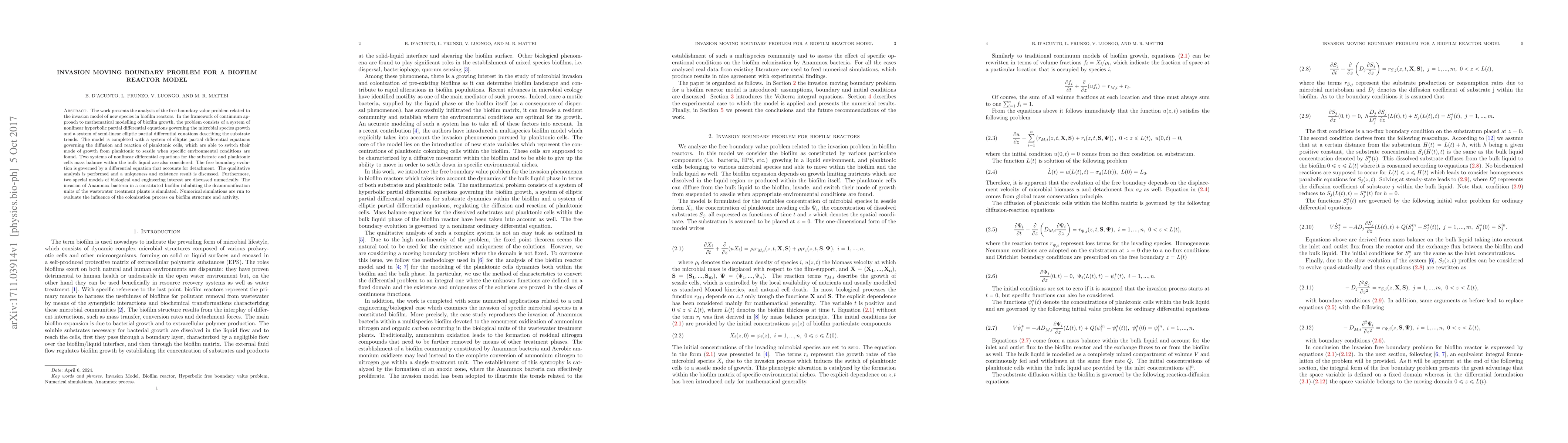The paper provides a detailed mathematical model and analysis of the invasion moving boundary problem in biofilm reactors, including systems of nonlinear PDEs for microbial growth, substrate trends, and planktonic cell dynamics.