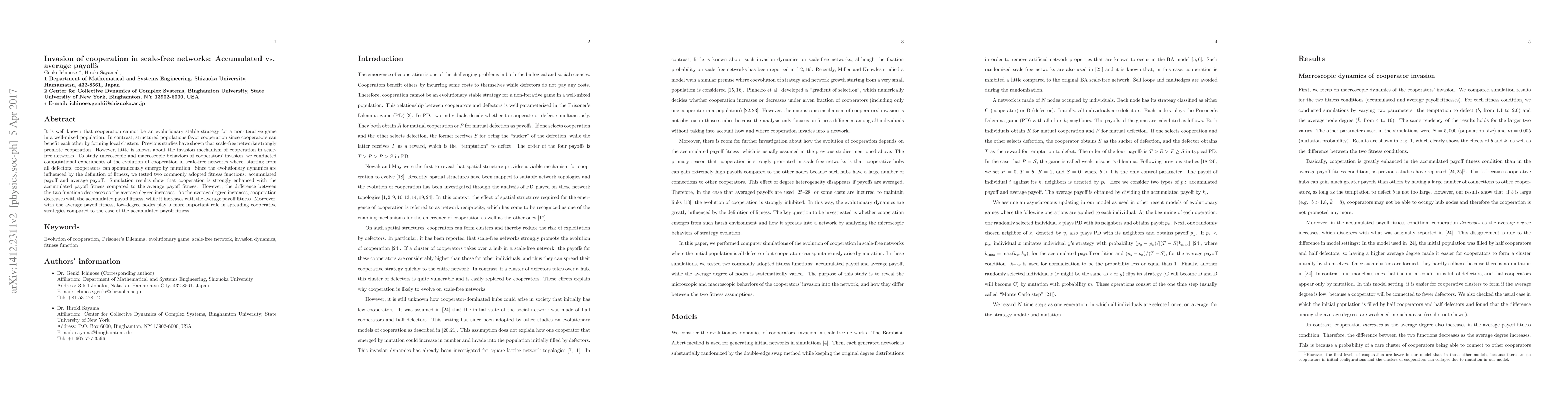 It is well known that cooperation cannot be an evolutionary stable strategy for a non-iterative game in a well-mixed population. In contrast, structured populations favor cooperation since cooperators can benefit each other by forming local clusters. Previous studies have shown that scale-free networks strongly promote cooperation. However, little is known about the invasion mechanism of cooperation in scale-free networks. To study microscopic and macroscopic behaviors of cooperators' invasion, we conducted computational experiments of the evolution of cooperation in scale-free networks where, starting from all defectors, cooperators can spontaneously emerge by mutation. Since the evolutionary dynamics are influenced by the definition of fitness, we tested two commonly adopted fitness functions: accumulated payoff and average payoff. Simulation results show that cooperation is strongly enhanced with the accumulated payoff fitness compared to the average payoff fitness. However, the difference between the two functions decreases as the average degree increases. As the average degree increases, cooperation decreases with the accumulated payoff fitness, while it increases with the average payoff fitness. Moreover, with the average payoff fitness, low-degree nodes play a more important role in spreading cooperative strategies compared to the case of the accumulated payoff fitness.