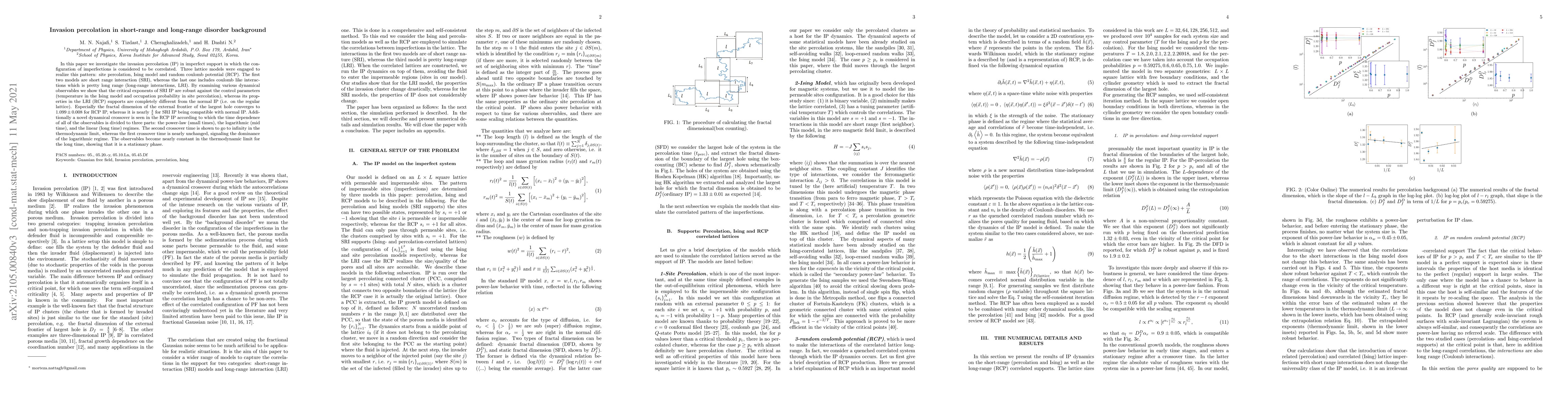 In this paper, we investigate the invasion percolation (IP) in imperfect support in which the configuration of imperfections is considered to be correlated. Three lattice models were engaged to realize this pattern: site percolation, Ising model and random Coulomb potential (RCP). The first two models are short range interaction (SRI), whereas the last one includes coulomb like interactions which is pretty long range (long-range interactions, LRI). By examining various dynamical observables we show that the critical exponents of SRI IP are robust against the control parameters (temperature in the Ising model and occupation probability in site percolation), whereas its properties in the LRI (RCP) supports are completely different from the normal IP (i.e. on the regular lattice). Especially the fractal dimension of the external frontier of the largest hole converges to $1.099\pm 0.008$ for RCP IP, whereas it is nearly $\frac{4}{3}$ for SRI IP being compatible with normal IP. Additionally a novel dynamical crossover is seen in the RCP IP according to which the time dependence of all of the observables is divided to three parts: the power-law (small times), the logarithmic (mid time), and the linear (long time) regimes. The second crossover time is shown to go to infinity in the thermodynamic limit, whereas the first crossover time is nearly unchanged, signaling the dominance of the logarithmic regime. The observables become nearly constant in the thermodynamic limit for the long time, showing that it is a stationary phase.
