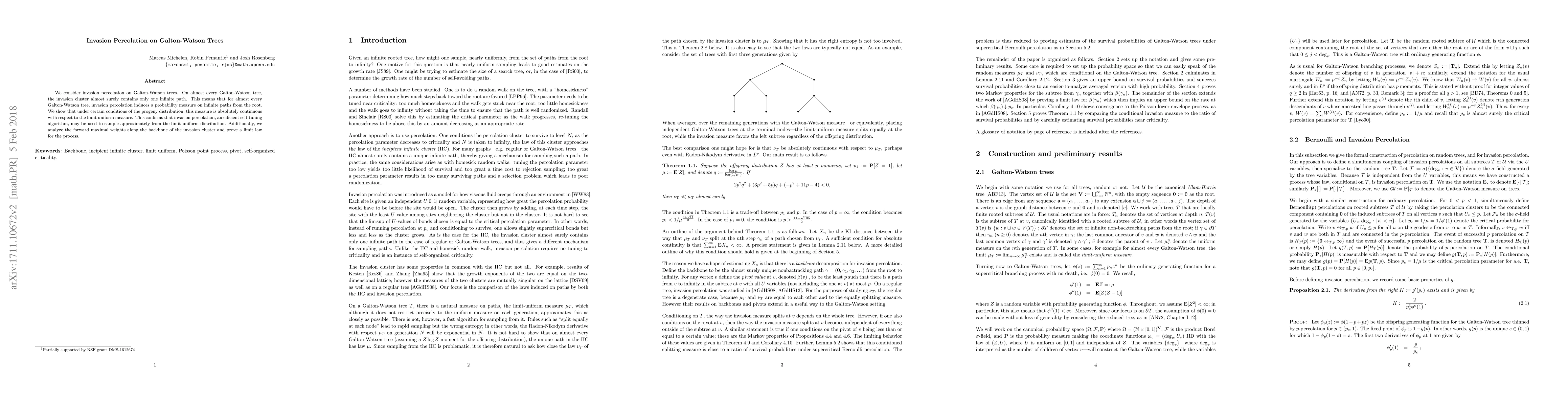 This paper studies invasion percolation on Galton-Watson trees, demonstrating that it almost surely induces a unique infinite path and an absolutely continuous probability measure under specific progeny distribution conditions. It also proves a limit law for the forward maximal weights along the invasion cluster's backbone.