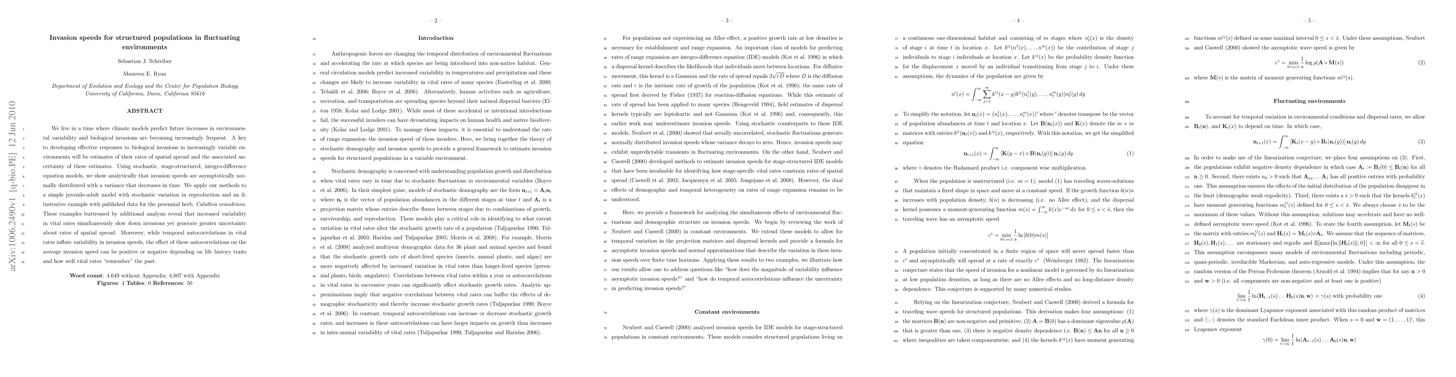 This paper investigates invasion speeds for structured populations in fluctuating environments using stochastic models, finding that increased environmental variability slows invasions but also increases uncertainty. It demonstrates that invasion speeds follow an asymptotically normal distribution with decreasing variance over time.