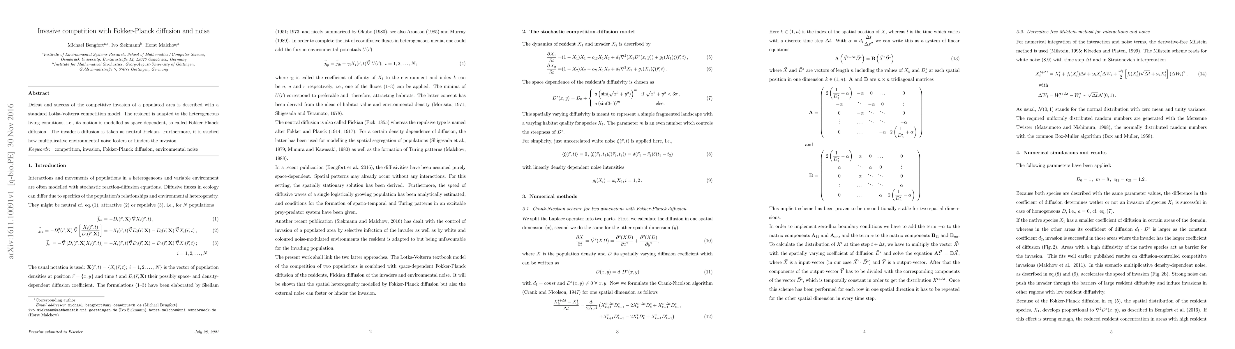 This research uses a Lotka-Volterra competition model to study how an invader's success in a populated area is influenced by the resident species' Fokker-Planck diffusion and the impact of multiplicative environmental noise on the invasion process.