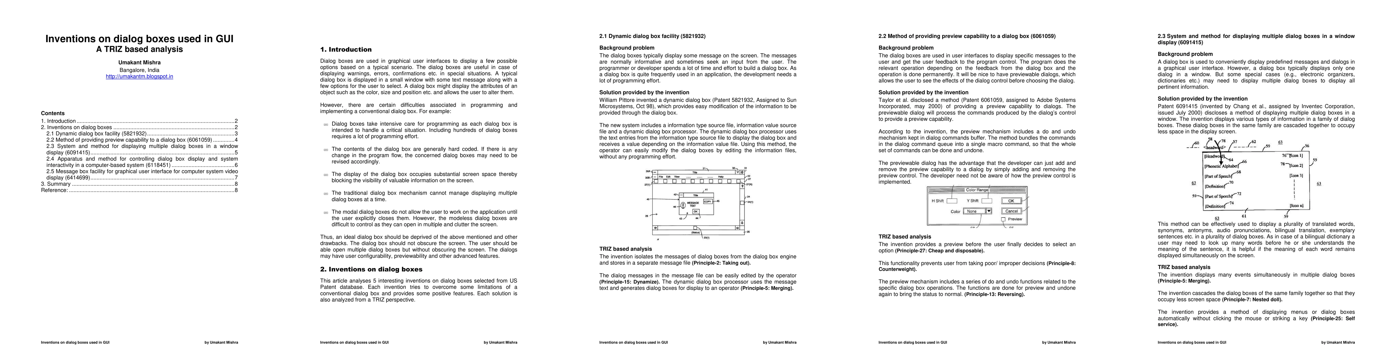 The dialog boxes are useful in case of displaying warnings, errors, confirmations etc. in special situations. A typical dialog box is displayed in a small window with some text message along with a few options for the user to select. However, there are certain difficulties associated in programming and implementing a conventional dialog box, such as, severe programming effort, rigidity of the hard coded message, obscuring screen space and so on. There is a need to overcome these difficulties of the dialog box to make them more efficient and useful. The modality of the dialog boxes also creates some limitations. While modal dialog boxes needs to be closed explicitly by the user, modeless dialog boxes can grow in number and become difficult to control. Thus, an ideal dialog box should be deprived of all the above-mentioned drawbacks. The dialog box should not obscure the screen. The user should be able open multiple dialog boxes but without obscuring the screen. This article analyses 5 interesting inventions on dialog boxes selected from US Patent database. Each invention tries to overcome some limitations of a conventional dialog box and provides some innovative features. Each solution is also analyzed from a TRIZ perspective.