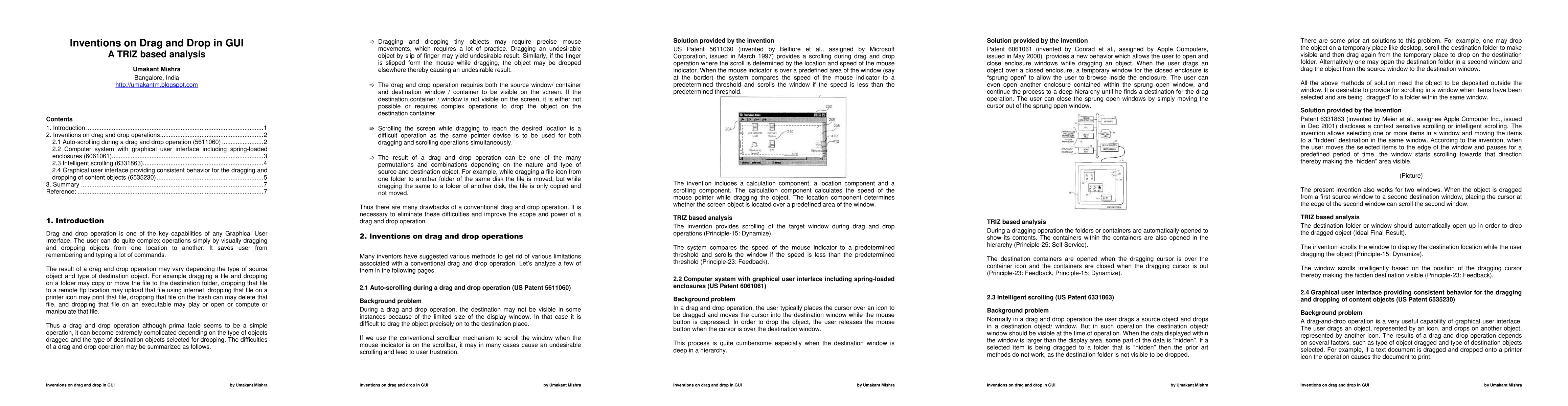 Drag and drop operation is one of the key capabilities of any Graphical User Interface. The user can do quite complex operations simply by visually dragging and dropping objects from one location to another. It saves user from remembering and typing a lot of commands. The result of a drag and drop operation may vary depending the type of source object and type of destination object. For example dragging a file and dropping on a folder may copy or move the file to the destination folder, dropping that file to a remote FTP location may upload that file using internet, dropping that file on a printer icon may print that file, dropping that file on the trash can may delete that file, and dropping that file on an executable may play or open or compute or manipulate that file. Although a drag and drop operation prima facie seems to be a simple operation, it can become extremely complicated depending on the type of source objects dragged and the type of destination objects selected for dropping. There are many limitations of a conventional drag and drop operation. This article points out the difficulties of a drag and drop operation and illustrates the solutions disclosed by various inventions to overcome those difficulties.
