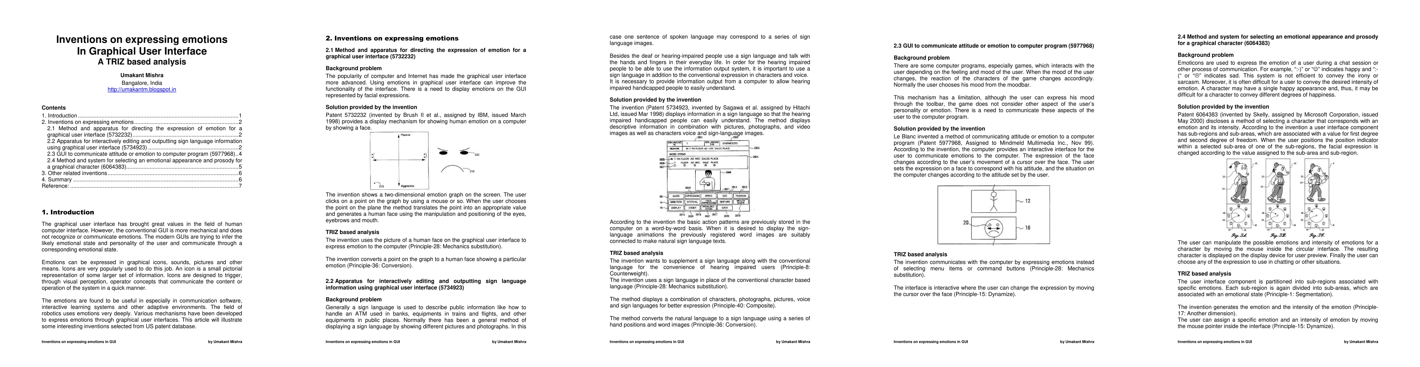 The conventional GUI is more mechanical and does not recognize or communicate emotions. The modern GUIs are trying to infer the likely emotional state and personality of the user and communicate through a corresponding emotional state. Emotions are expressed in graphical icons, sounds, pictures and other means. The emotions are found to be useful in especially in communication software, interactive learning systems, robotics and other adaptive environments. Various mechanisms have been developed to express emotions through graphical user interfaces. This article illustrates some interesting inventions selected from US patent database.