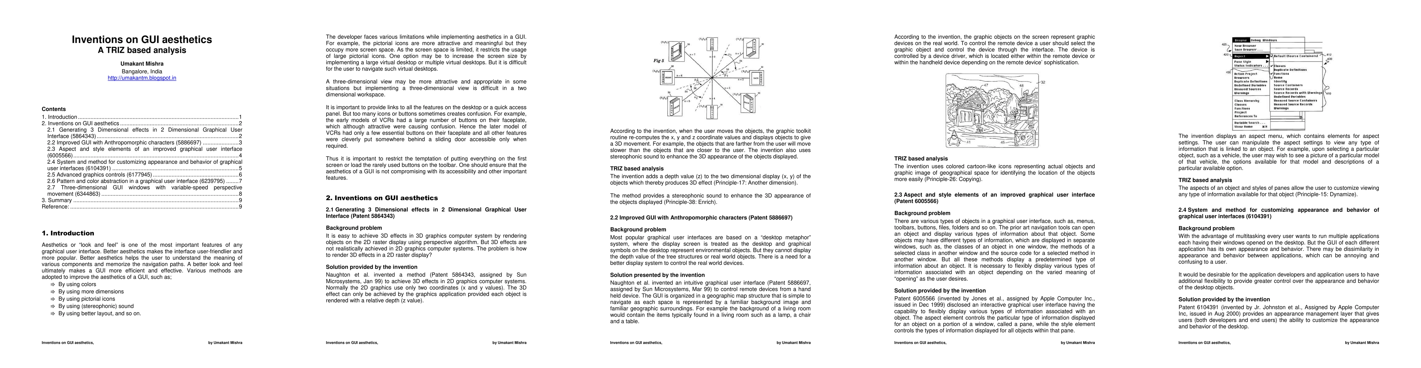 Aesthetics or "look and feel" is one of the most important features of any graphical user interface. Better aesthetics makes the interface user-friendlier and more popular. Better aesthetics helps the user to understand the meaning of various components and memorize the navigation paths. A better look and feel ultimately makes a GUI more efficient and effective. Various methods are adopted to improve the aesthetics of a GUI, such as, by using colors, using 3D graphics, using pictorial icons, using sound etc. It is important to provide links to all the important features on a desktop or on a quick access panel. But too many icons or buttons sometimes creates confusion. Hence it is important to restrict the temptation of putting everything on the first screen or load the rarely used buttons on the toolbar. One should ensure that the aesthetics of a GUI is not compromising with its accessibility and other important features. This article illustrates some inventions made on GUI aesthetics.