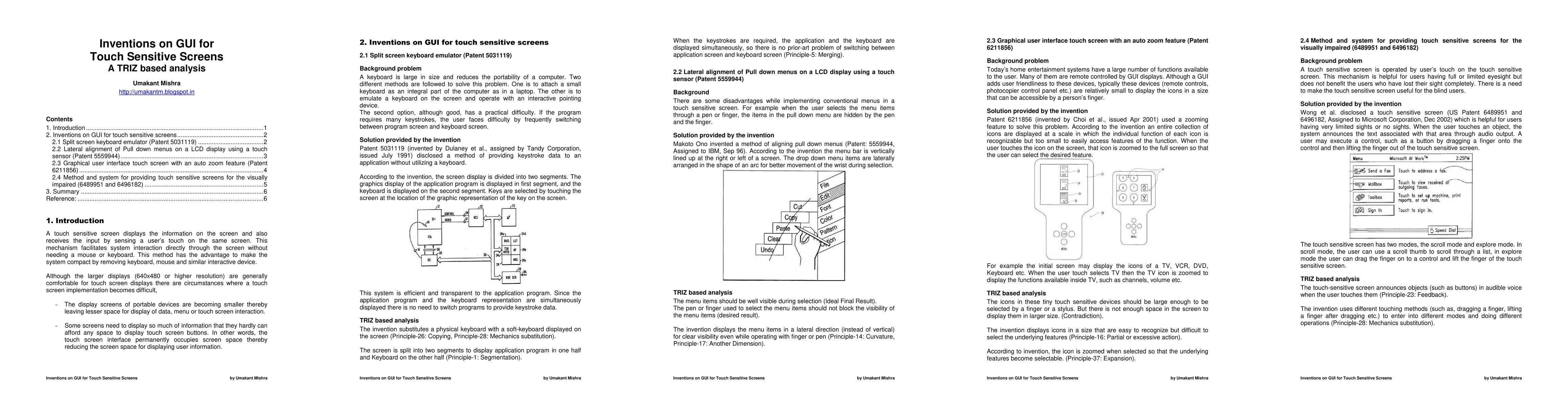 A touch sensitive screen displays the information on the screen and also receives the input by sensing a user's touch on the same screen. This mechanism facilitates system interaction directly through the screen without needing a mouse or keyboard. This method has the advantage to make the system compact by removing keyboard, mouse and similar interactive device. However there are certain difficulties to implement a touch screen interface. The display screens of portable devices are becoming smaller thereby leaving lesser space for display of data, menu or touch screen interaction. Besides some screens need to display so much of information that they hardly can afford any space to display touch screen buttons. This article illustrates various inventions which have successfully eliminated these difficulties by applying appropriate Inventive principles.