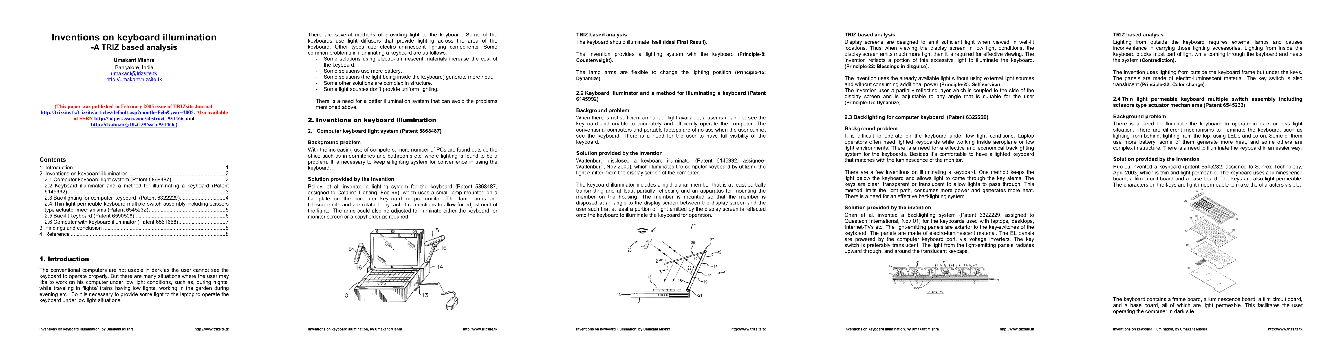 The conventional computers are not usable in dark, as the user cannot see the keyboard to operate properly. But there are many situations where the user may like to work on his computer under low light conditions, such as, during nights, while traveling in flights/ trains having low lights, working in the garden during evening etc. So it is necessary to provide some light to the laptop to operate the keyboard under low light situations. Luminescence of the keyboard is a desirable feature for portable computers. There may be several methods to illuminate the keyboard, the most crude may be carrying an external light and fixing at a point where it can light the keyboard. But solutions like this are not very convenient. The inventors have been looking for better solutions. This article analyses 6 patents on keyboard illumination. A good illumination system do not consume more battery, do not increase the size and weight of the laptop, do not increase heat inside the laptop box, and do not cost much to manufacture. The light should uniformly illuminate the whole keyboard and should not throw light on other areas that are not required.