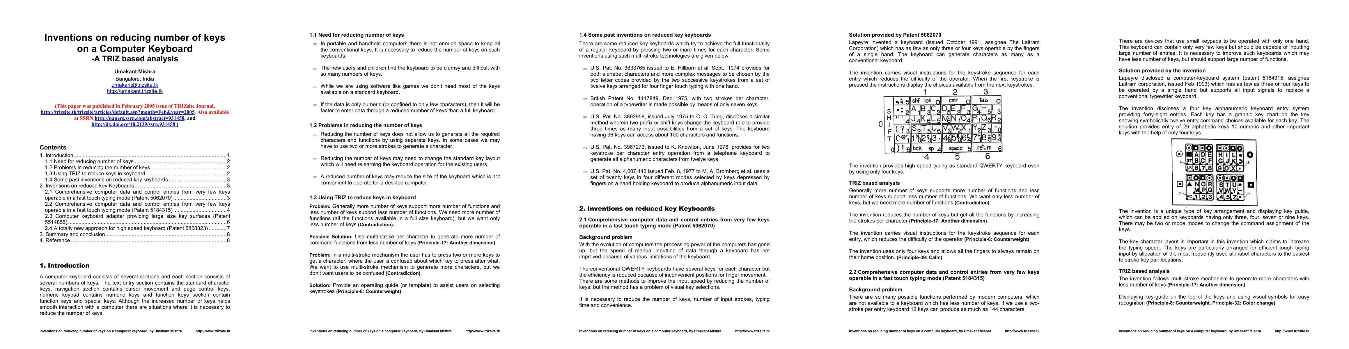 A computer keyboard consists of several sections and each section consists of several numbers of keys. The text entry section contains the standard character keys, navigation section contains cursor movement and page control keys, numeric keypad contains numeric keys and function keys section contain function keys and special keys. Although the increased number of keys helps smooth interaction with a computer there are situations where it is necessary to reduce the number of keys. The need for reducing number of keys in a keyboard creates a technical contradiction. Generally more number of keys can support more number of functions and less number of keys can support less number of functions. We need more number of functions (all the functions available in a full size keyboard), but we want only less number of keys (Contradiction). This contradiction has been solved by using multi-stroke mechanism. There may be different purposes to reduce the number of keys in a keyboard. Some of them intend to reduce the size of the keyboard while some others intend to increase the speed of typing. But all of these inventions use multi-stroke mechanism to generate more number of signals from less number of keys.