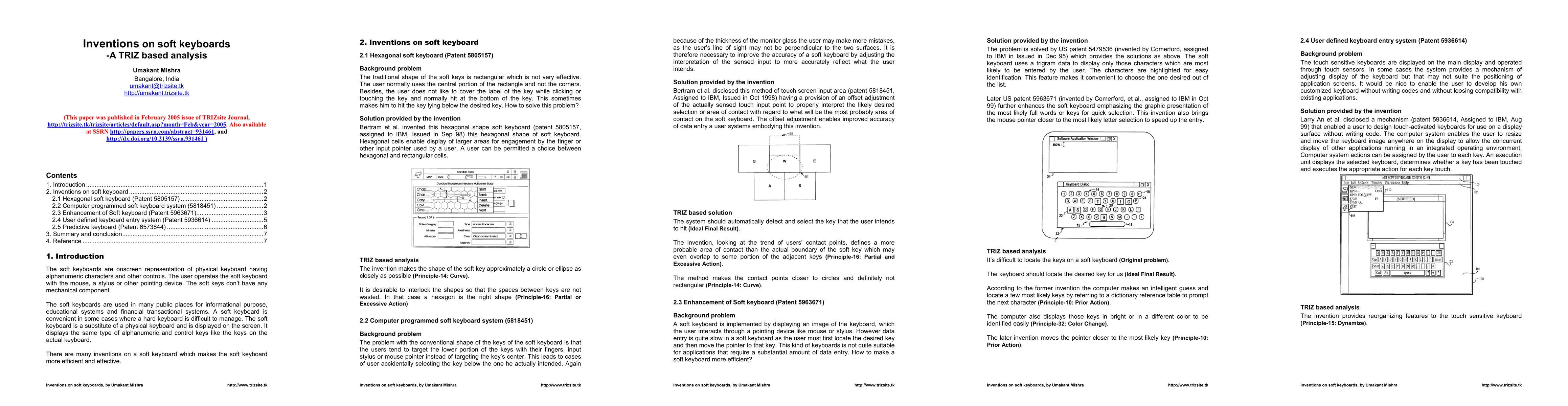 This paper explores various inventions on soft keyboards, focusing on innovations that enhance their efficiency and effectiveness. It utilizes TRIZ methodology to analyze and categorize these inventions from the US patent database, highlighting their applications in public, educational, and financial systems.